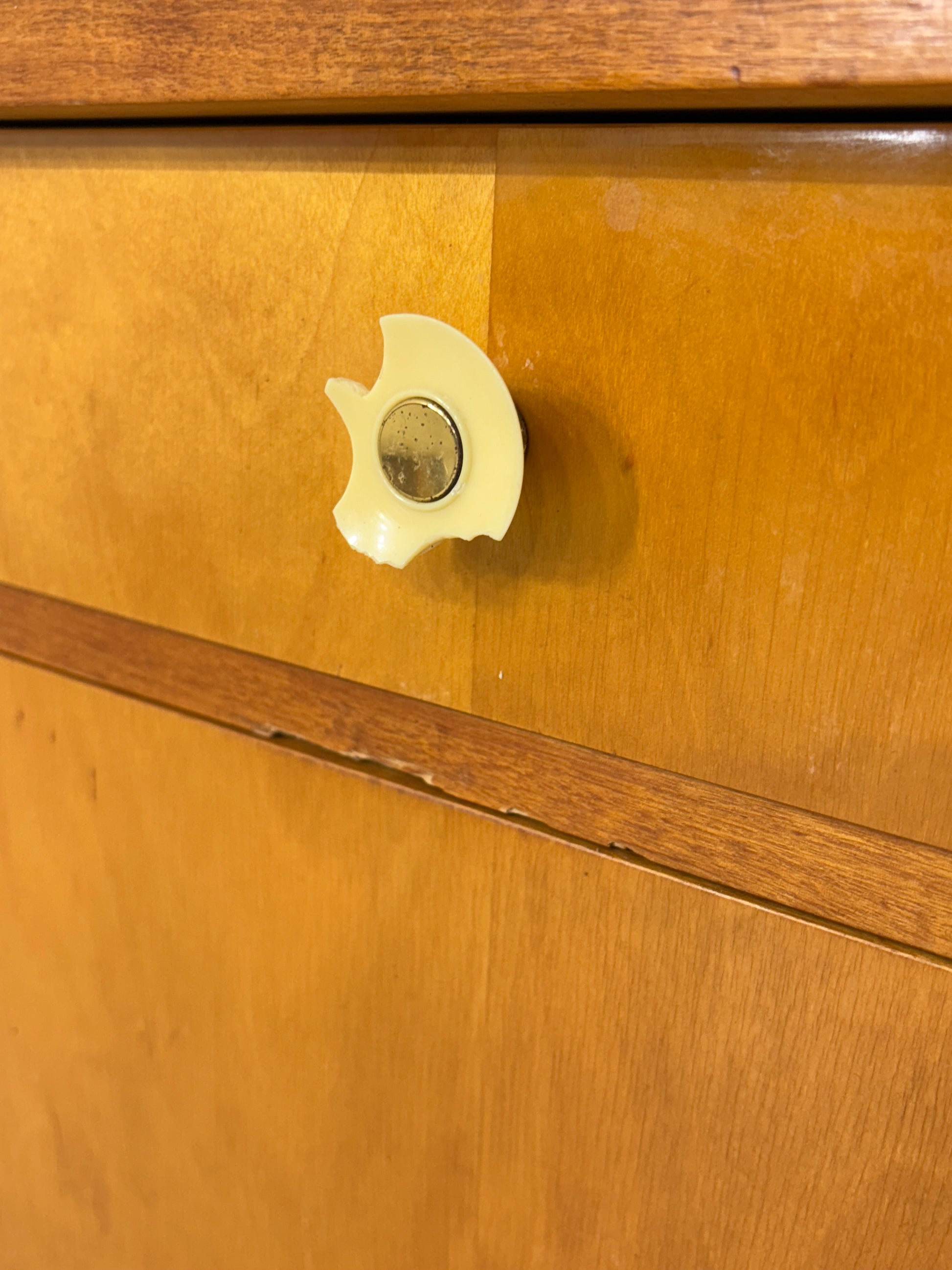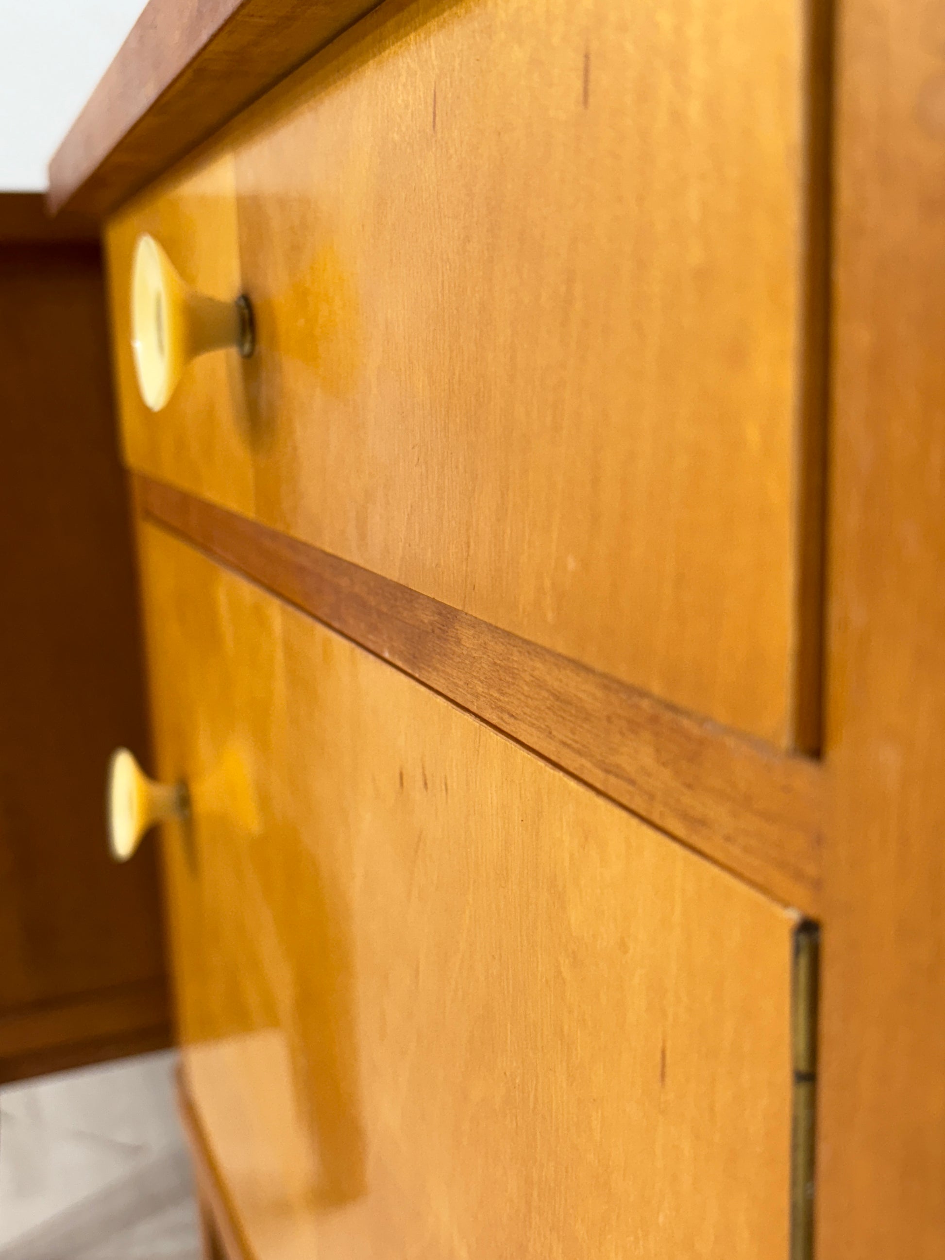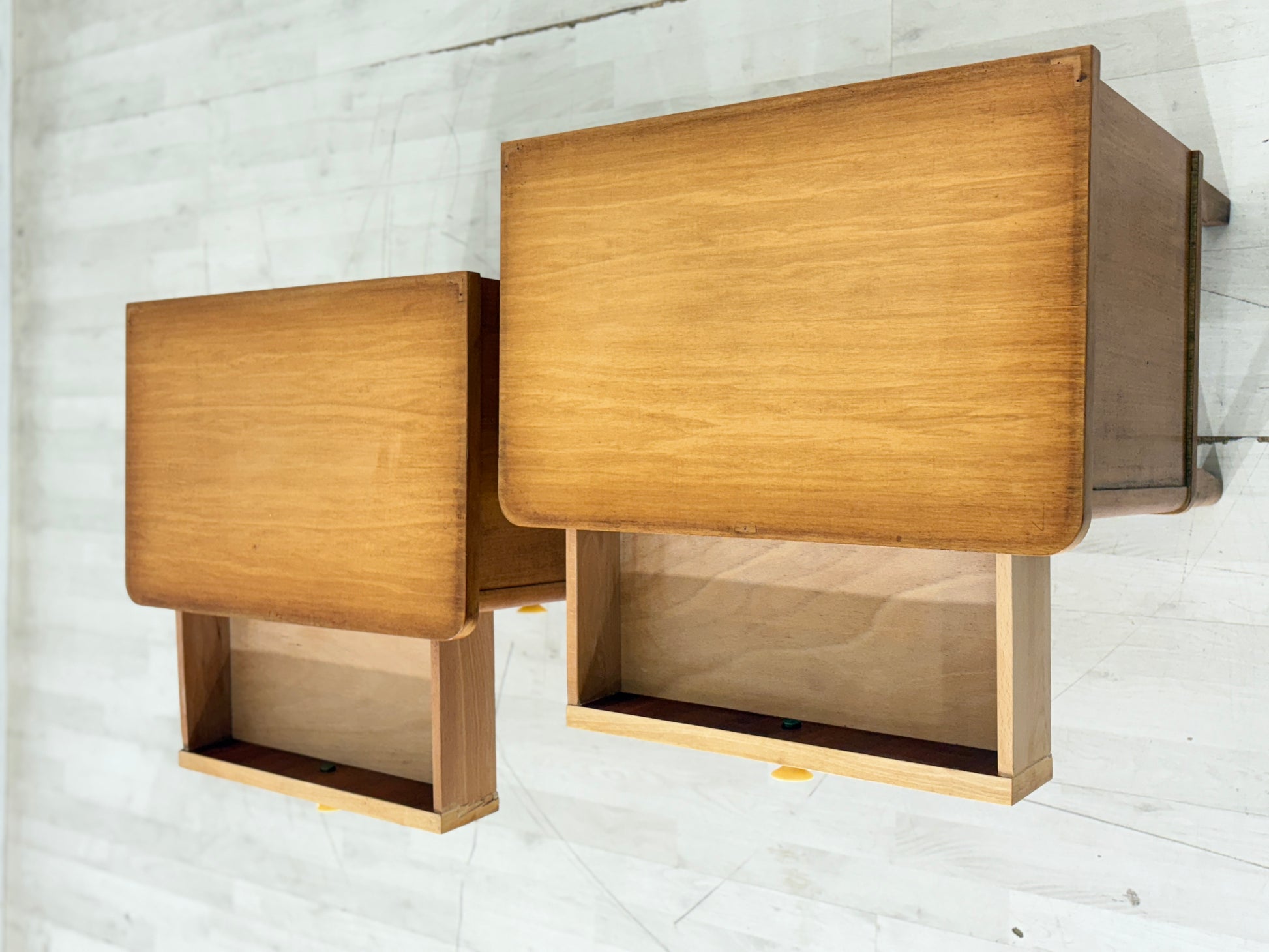 Einer der Nachttische weist eine kleine Beschädigung am Schubladengriff auf (siehe Foto), ansonsten befinden sich beide in gutem, gepflegtem Vintage-Zustand mit altersentsprechenden Gebrauchsspuren.