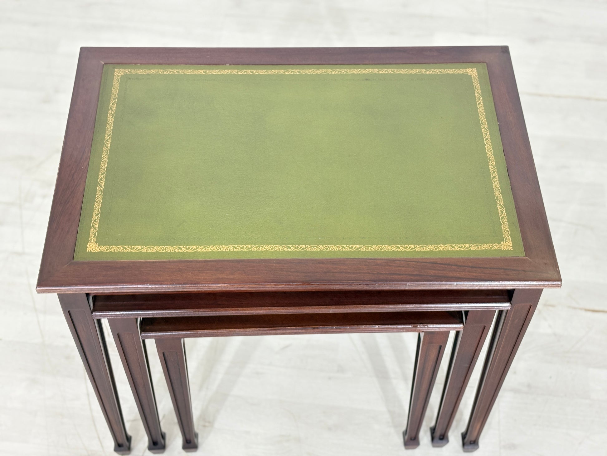 Die Tische sind aus edlem Mahagoniholz gefertigt und verfügen über eine elegante Lederauflage, die sich in einem makellosen Zustand befindet.