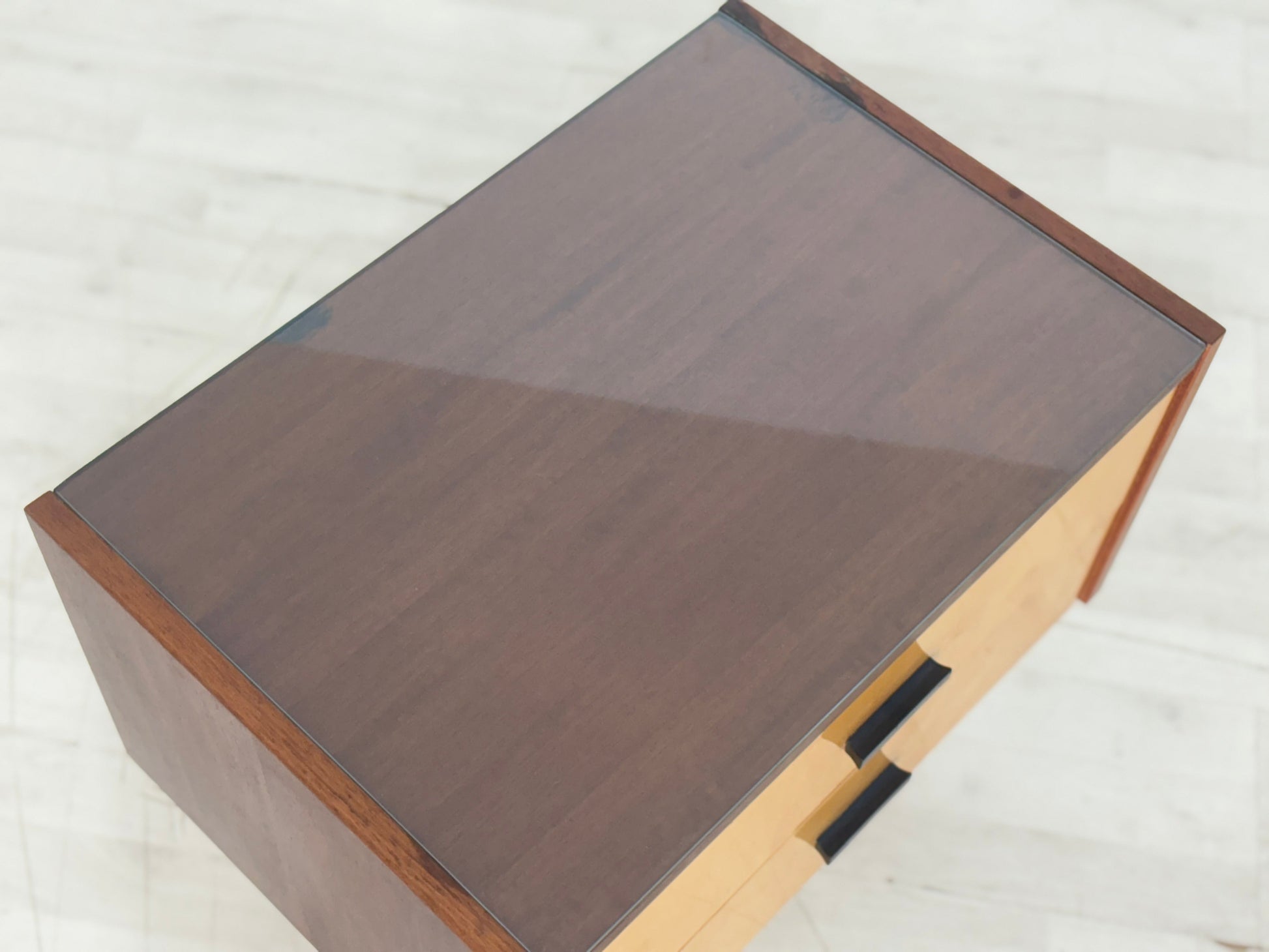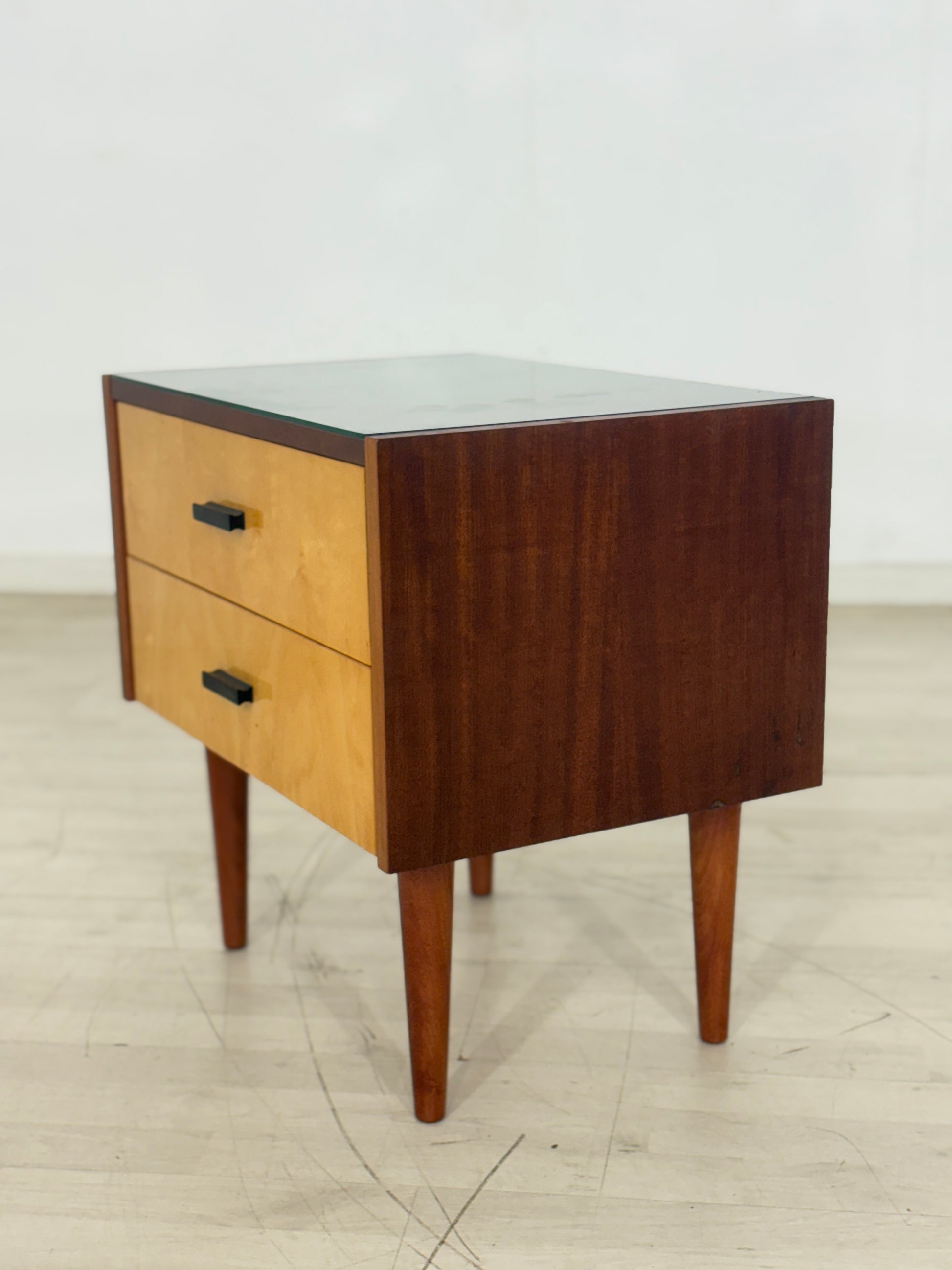 Charming 1960s nightstand available for sale. It's in well-preserved original condition, and features removable glass. Perfect for vintage enthusiasts.