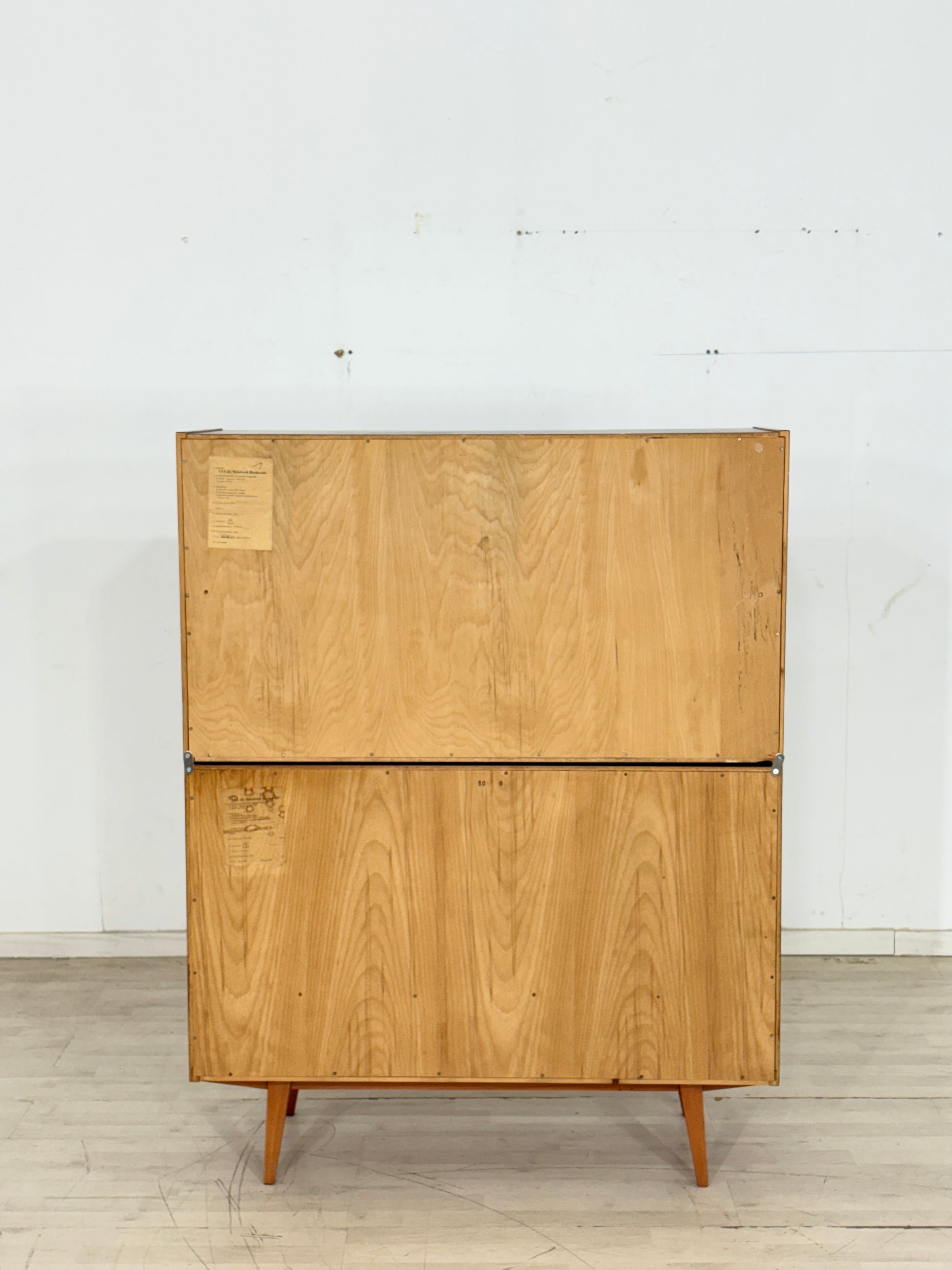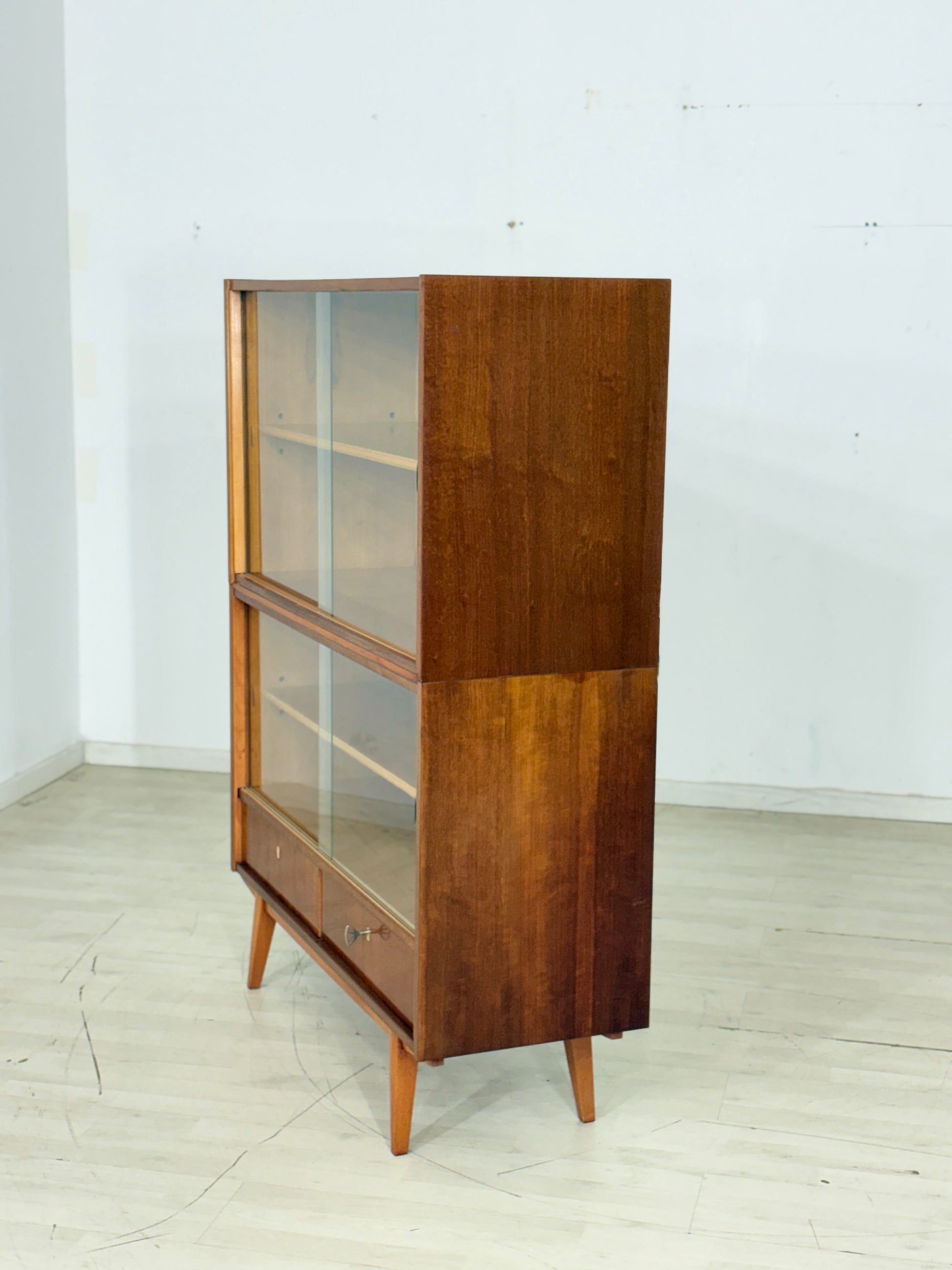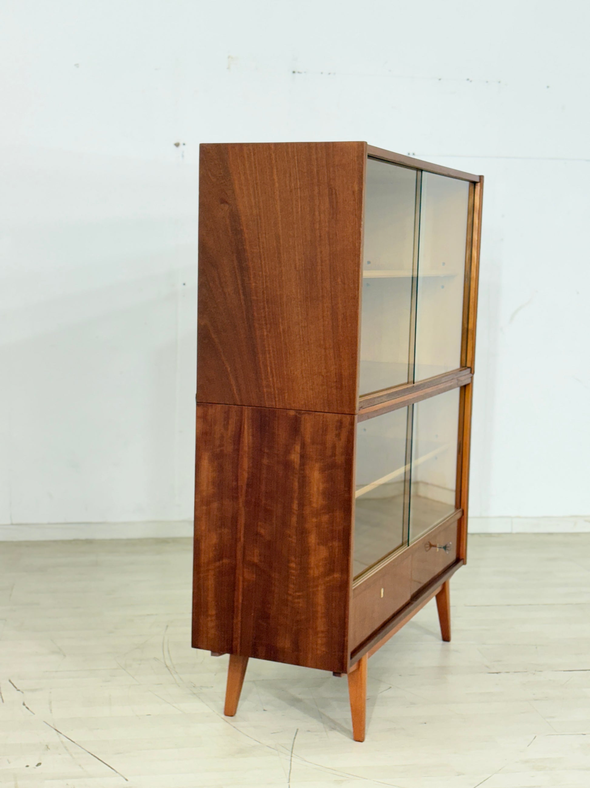 For sale is a well-preserved vintage display cabinet from 1964 – a true original! It consists of two parts (upper and lower section) and impresses with its timeless design. The lower section offers two practical yet stylish drawers with plenty of storage space.