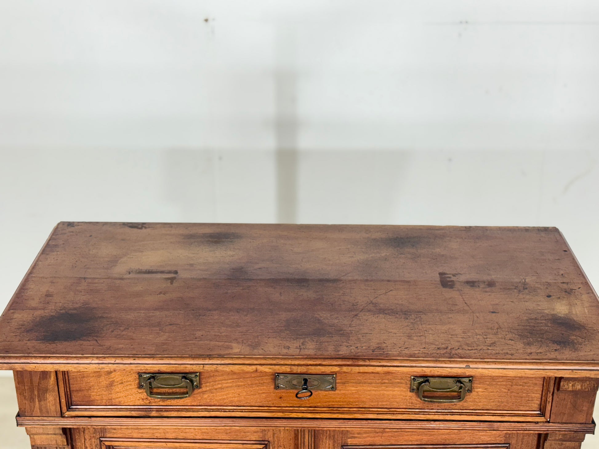 Das handgearbeitete Holz mit seinen feinen Verzierungen, die originalen Messinggriffe und das elegante, antike Design verleihen diesem Stück einen ganz besonderen Charme.
