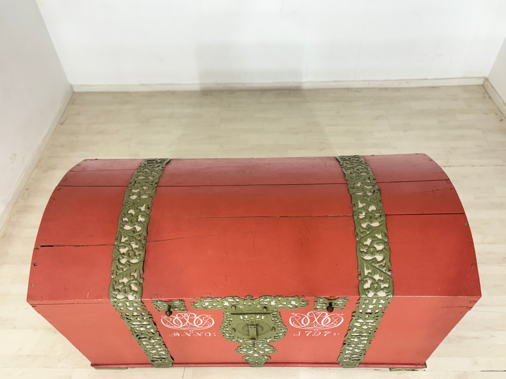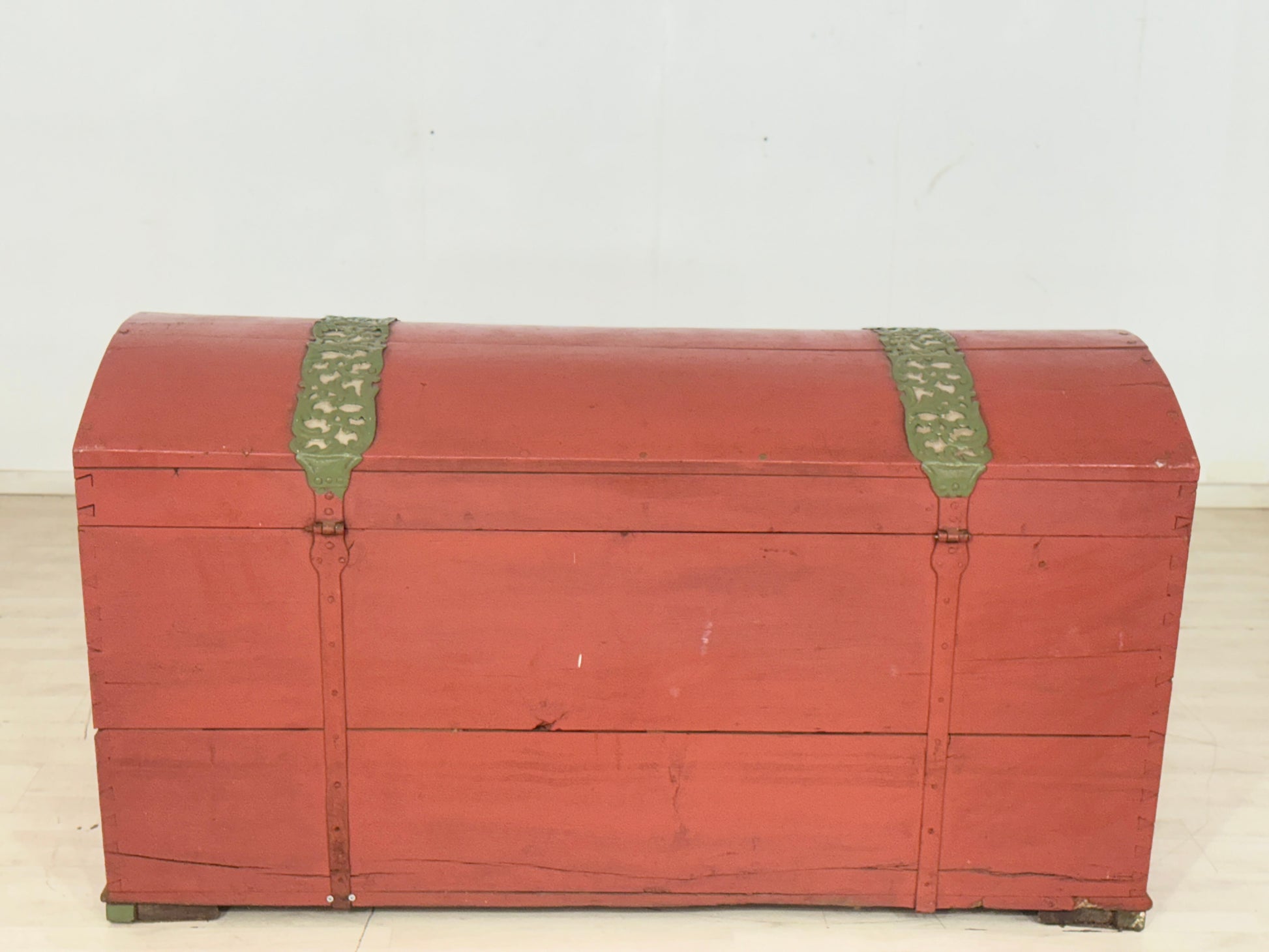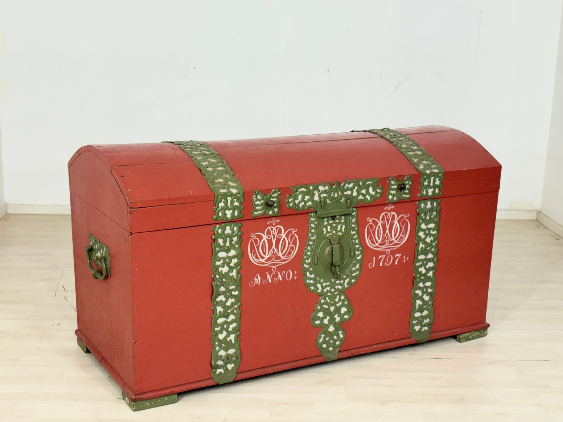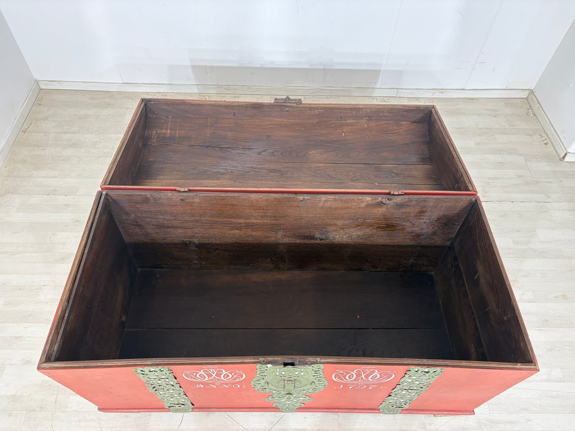 Diese prachtvolle Truhe ist ein authentisches Zeugnis ihrer Epoche und besticht durch die charakteristische, rustikale Bemalung (wie auf den Bildern zu sehen). Sie wurde aus massivem Altholz gefertigt, was ihr nicht nur einen unvergleichlichen Charme, sondern auch ein beträchtliches Gewicht und eine hohe Langlebigkeit verleiht. Ein echtes Sammlerstück.