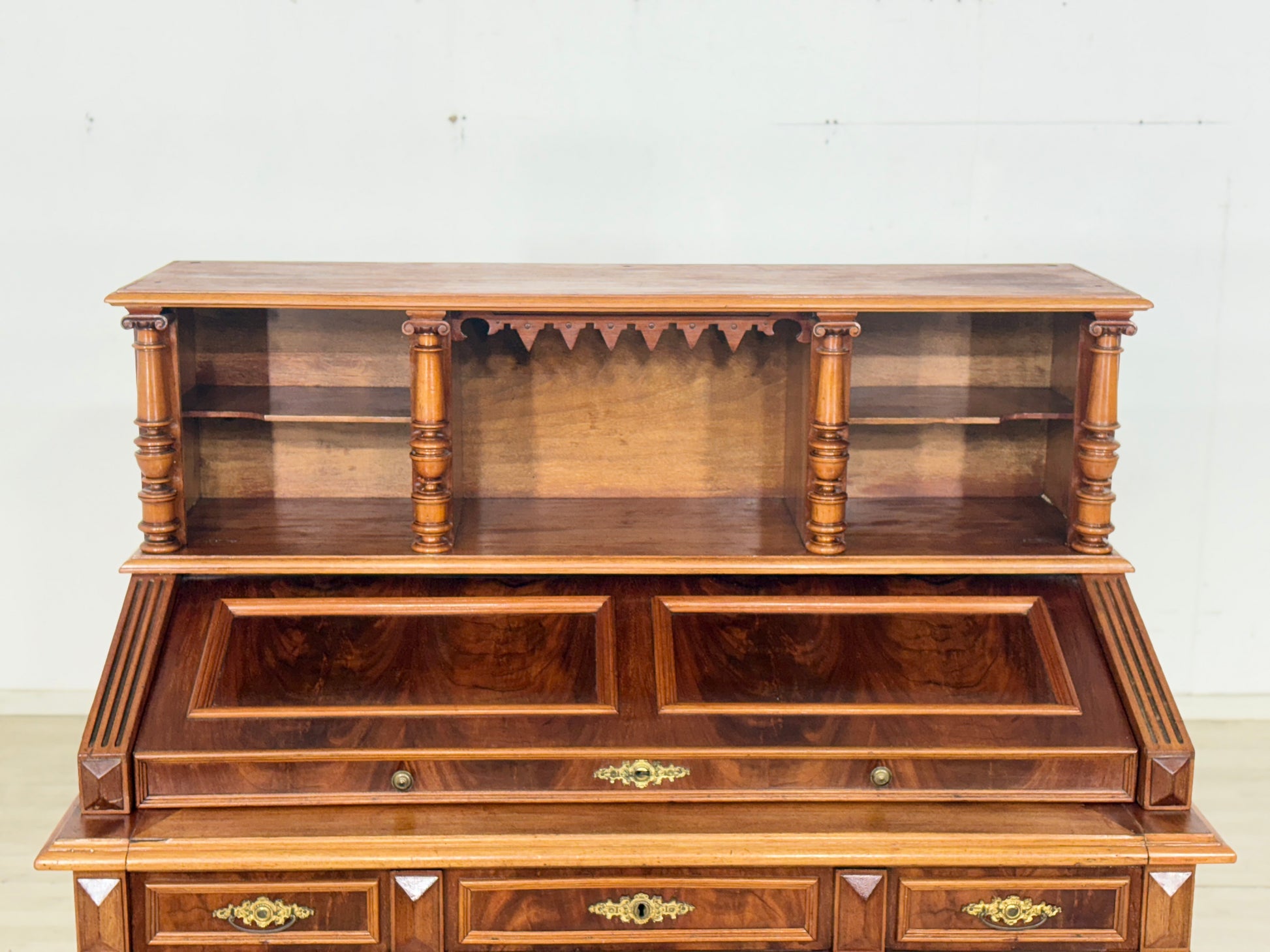 Wir bieten diesen stilvollen Gründerzeit Schreibtisch aus der Zeit um 1880 zum Verkauf an. Das Möbelstück präsentiert sich in einem gepflegten, guten Gebrauchtzustand. Charakteristisch ist der aufwendig handgearbeitete und reich verzierte Aufsatz, der dem Schreibtisch eine besonders schöne und historische Ausstrahlung verleiht. Ein elegantes Original, das sofort ins Auge fällt.
