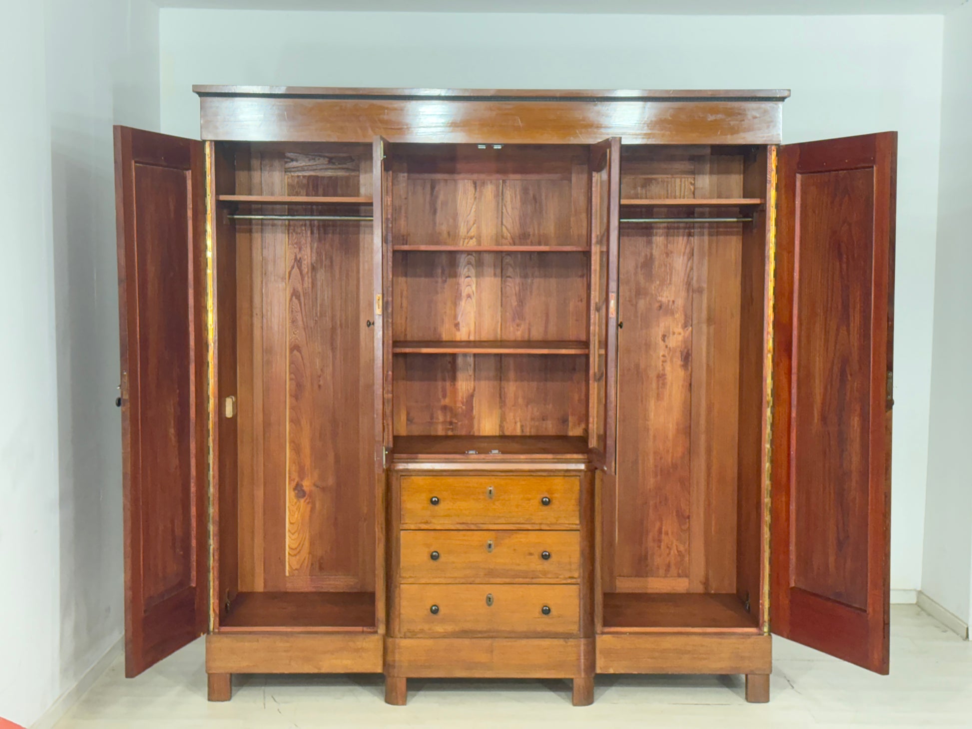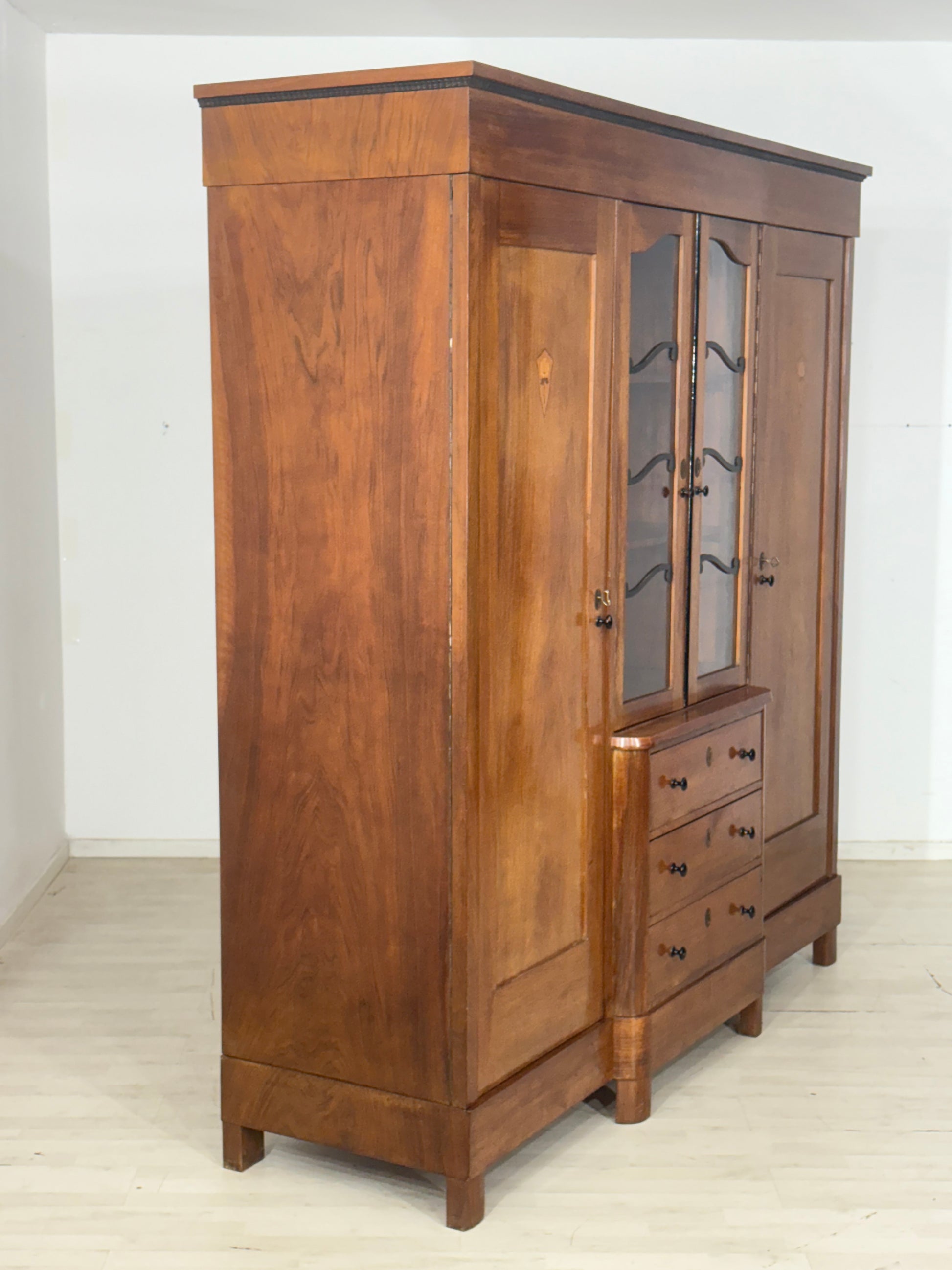 Zum Verkauf steht ein sehr schöner Kleiderschrank aus Erstbesitz um 1920, aus einem gepflegten Nichtraucherhaushalt. Der Schrank verfügt auf der linken und rechten Seite jeweils über einen Regalboden und eine Kleiderstange; beide Seiten sind abschließbar. Die Türen sind mit zwei handgefertigten Blumen-Intarsien verziert, die dem Möbelstück einen besonderen Charme verleihen. Im oberen mittleren Bereich befinden sich zwei weitere Regalböden, darunter drei große Schubfächer. Die Schlüssel für den Mittelteil fehlen zwar, dies beeinträchtigt die Funktionalität jedoch nicht. An einigen äußeren Stellen sowie auf der Rückseite sind inaktive Wurmlöcher vorhanden, die den Charakter des antiken Stücks unterstreichen.