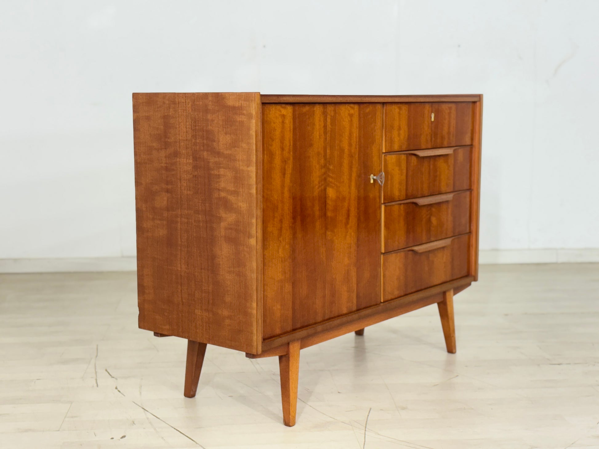 For sale is a very beautiful chest of drawers from 1964 in original condition. The chest has four drawers on the right side, with the top drawer being lockable. The left side has a door, which is also lockable.