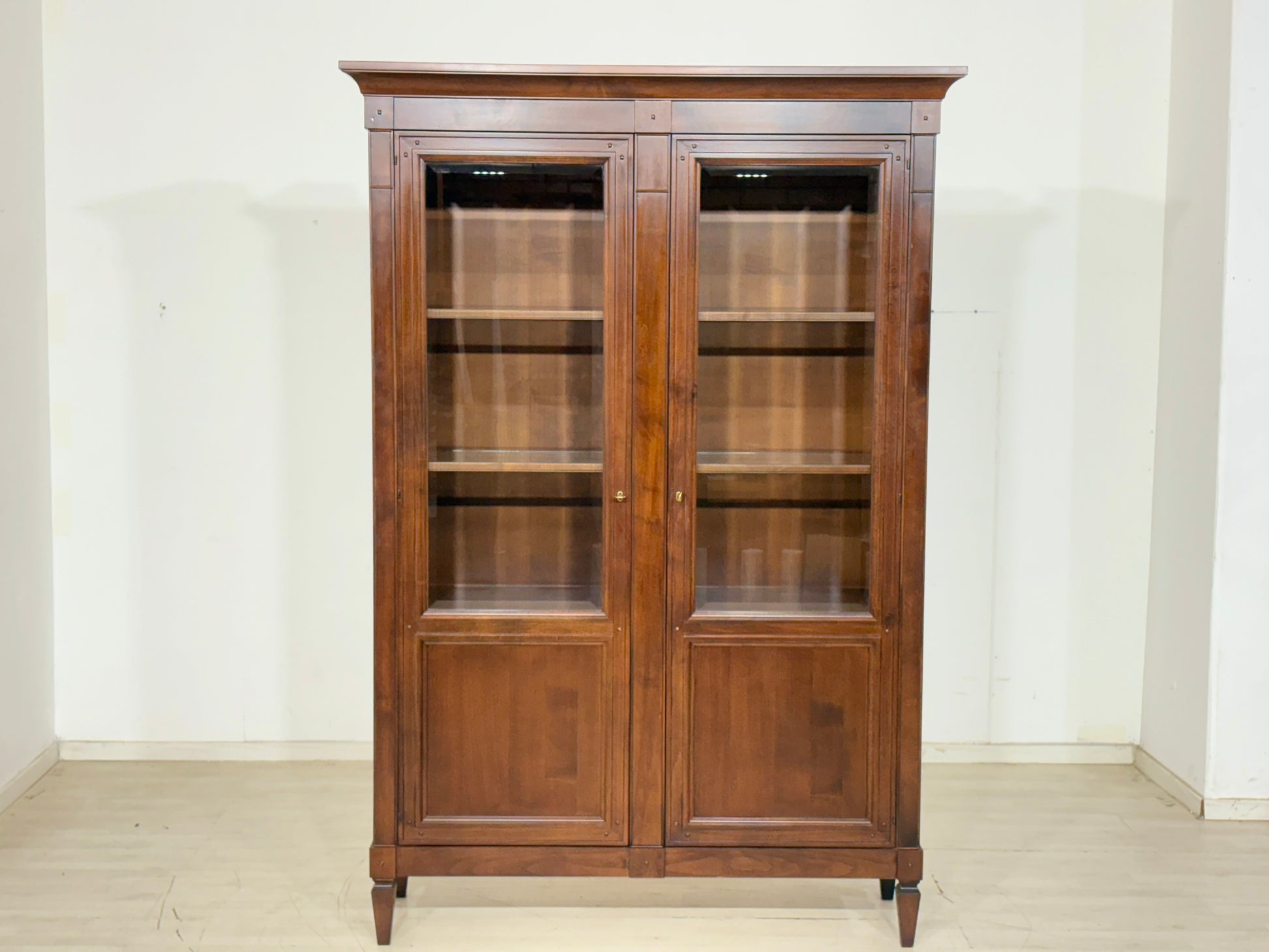 Zum Verkauf steht eine sehr schöne Vitrine der Marke Selva aus Italien. Die Vitrine verfügt über zwei Türen, zwei Glasböden sowie zwei Holzböden. Dank ihrer stilvollen Innenbeleuchtung und dem warmen Nussbaumholz verleiht sie Ihrem Wohn- oder Essbereich eine angenehme, einladende Atmosphäre. Die Originalschlüssel sind selbstverständlich vorhanden, und die Türen sind abschließbar.