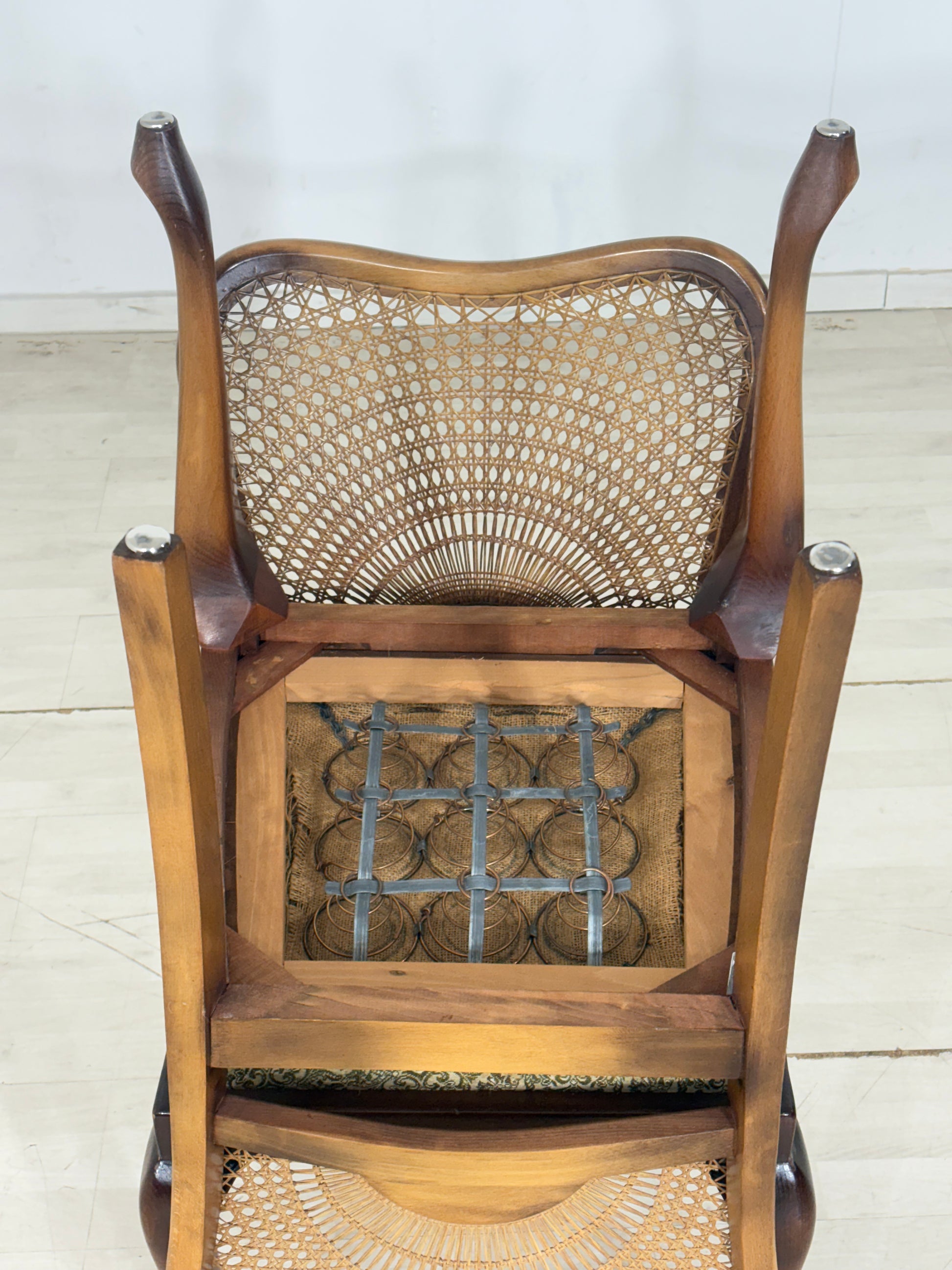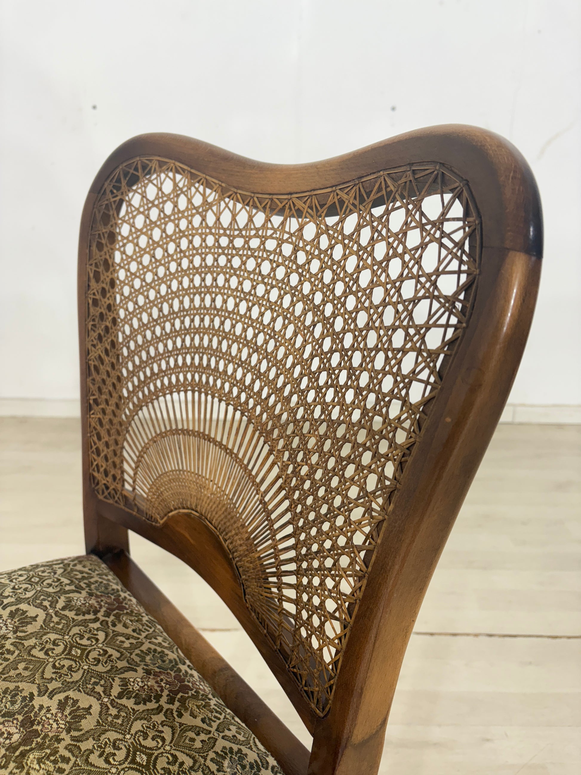 Ein Stuhl hat einen kleineren Defekt im Geflecht der Rückenlehne (siehe Detailfoto).