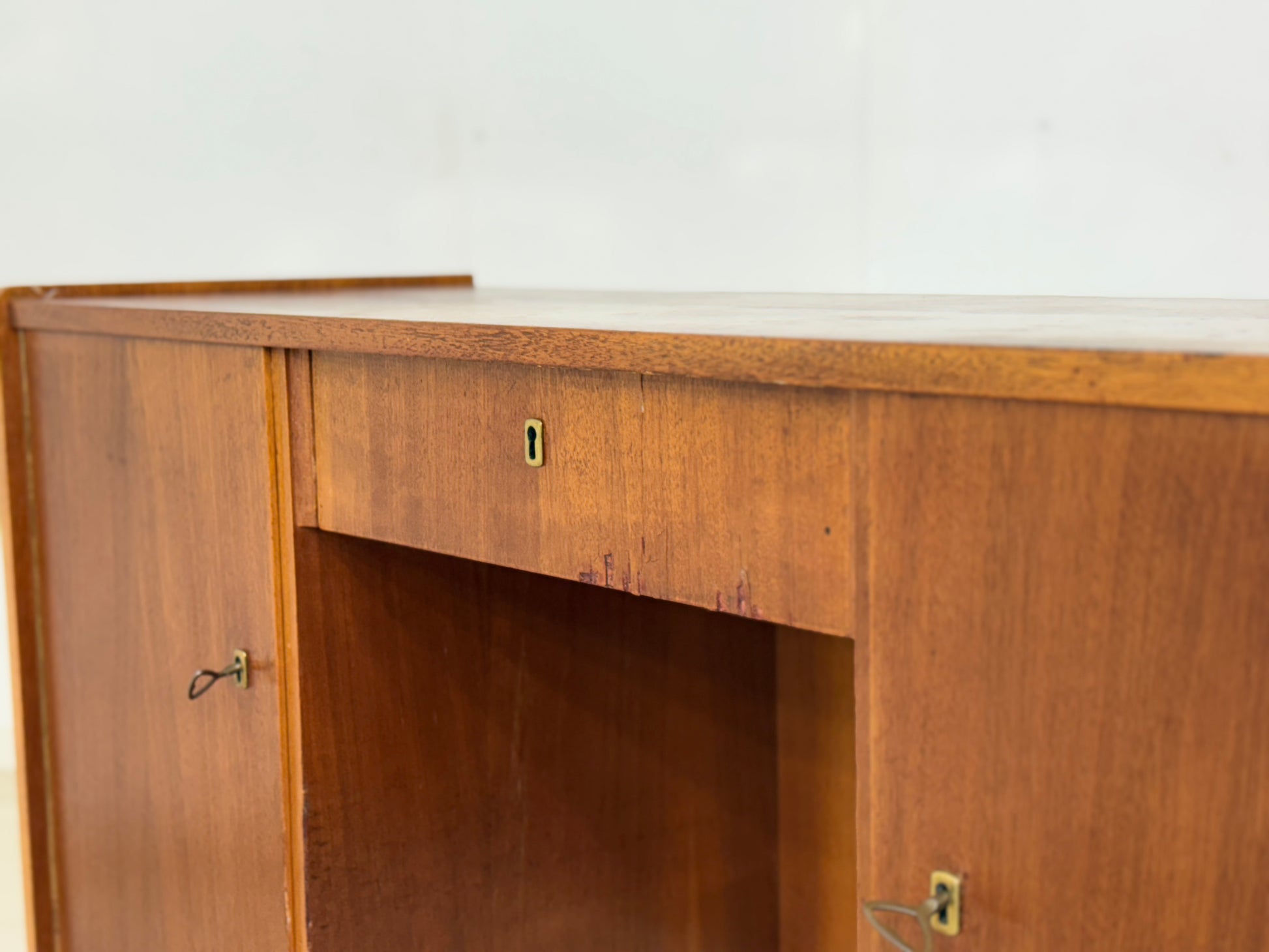 Zum Verkauf steht ein sehr schöner Vintage Schreibtisch. Der Tisch hat einige Furnierschäden, welche mit Beizenstifte überarbeitet sind. Siehe Bilder!
