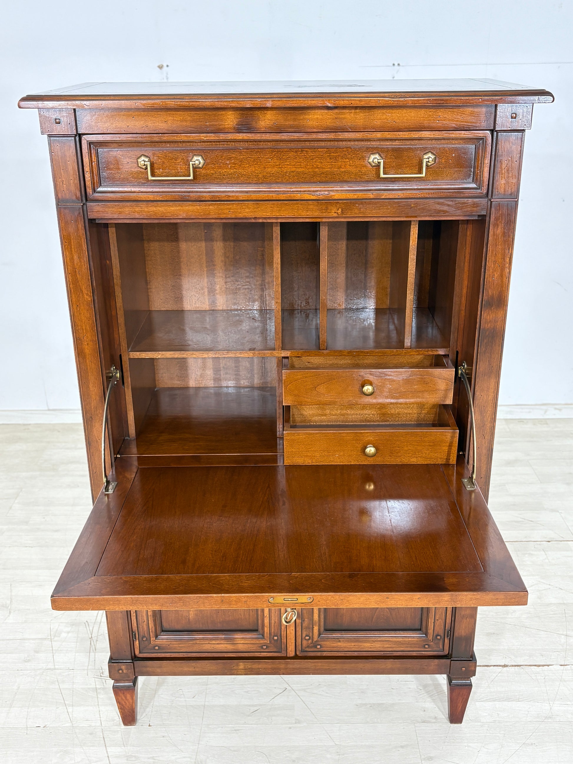 Zum Verkauf steht ein schöner Sekretär der Marke Selva aus Italien. Der Sekretär befindet sich in gutem Zustand und weist lediglich auf der Oberfläche leichte Gebrauchsspuren auf (siehe Foto von oben). Er verfügt über eine große Schublade im oberen Bereich sowie eine praktische, aufklappbare Arbeitsplatte. Im Innenfach befinden sich zwei kleine Schubladen, und im unteren Bereich bieten zwei abschließbare Türen zusätzlichen Stauraum.