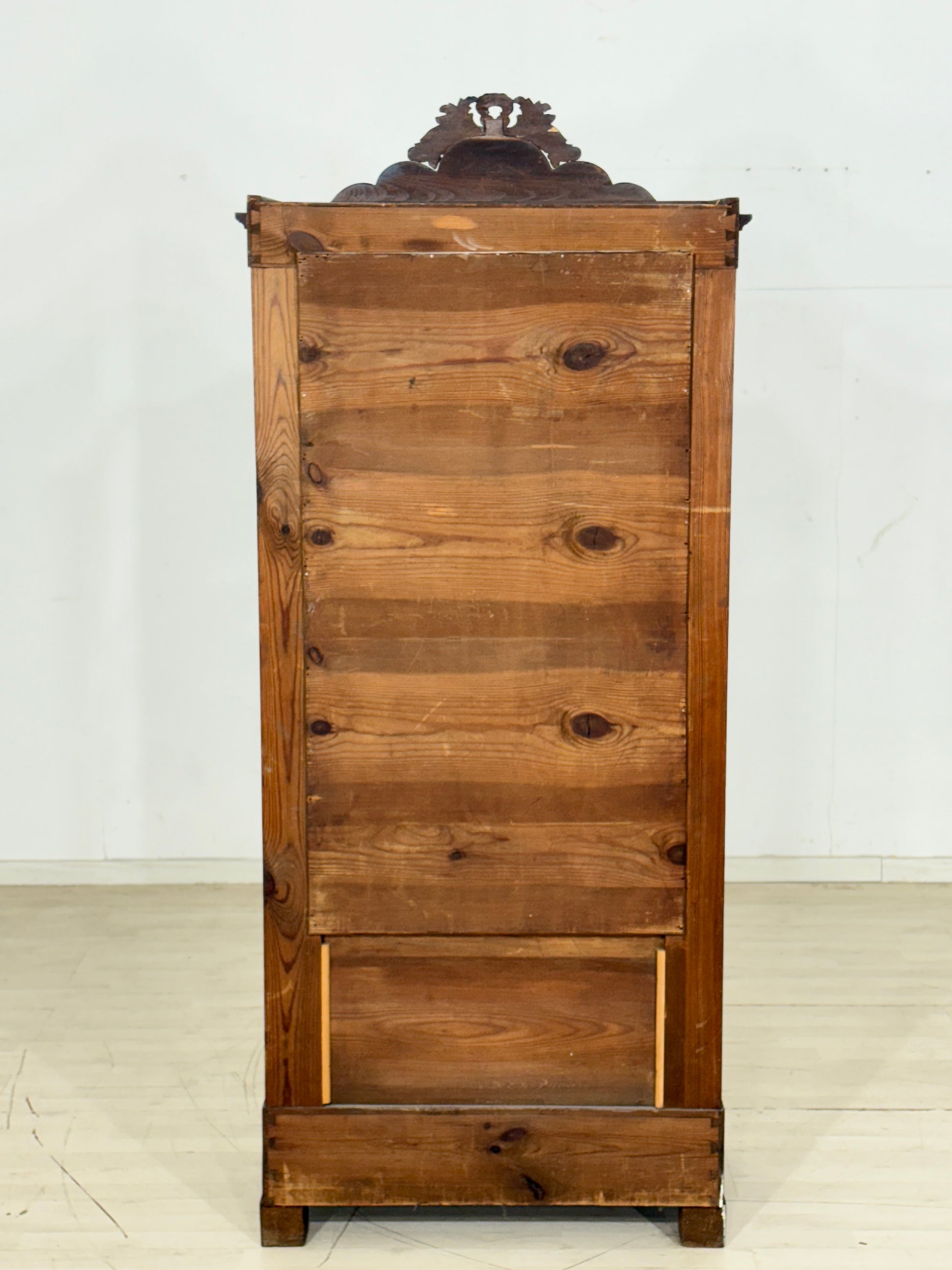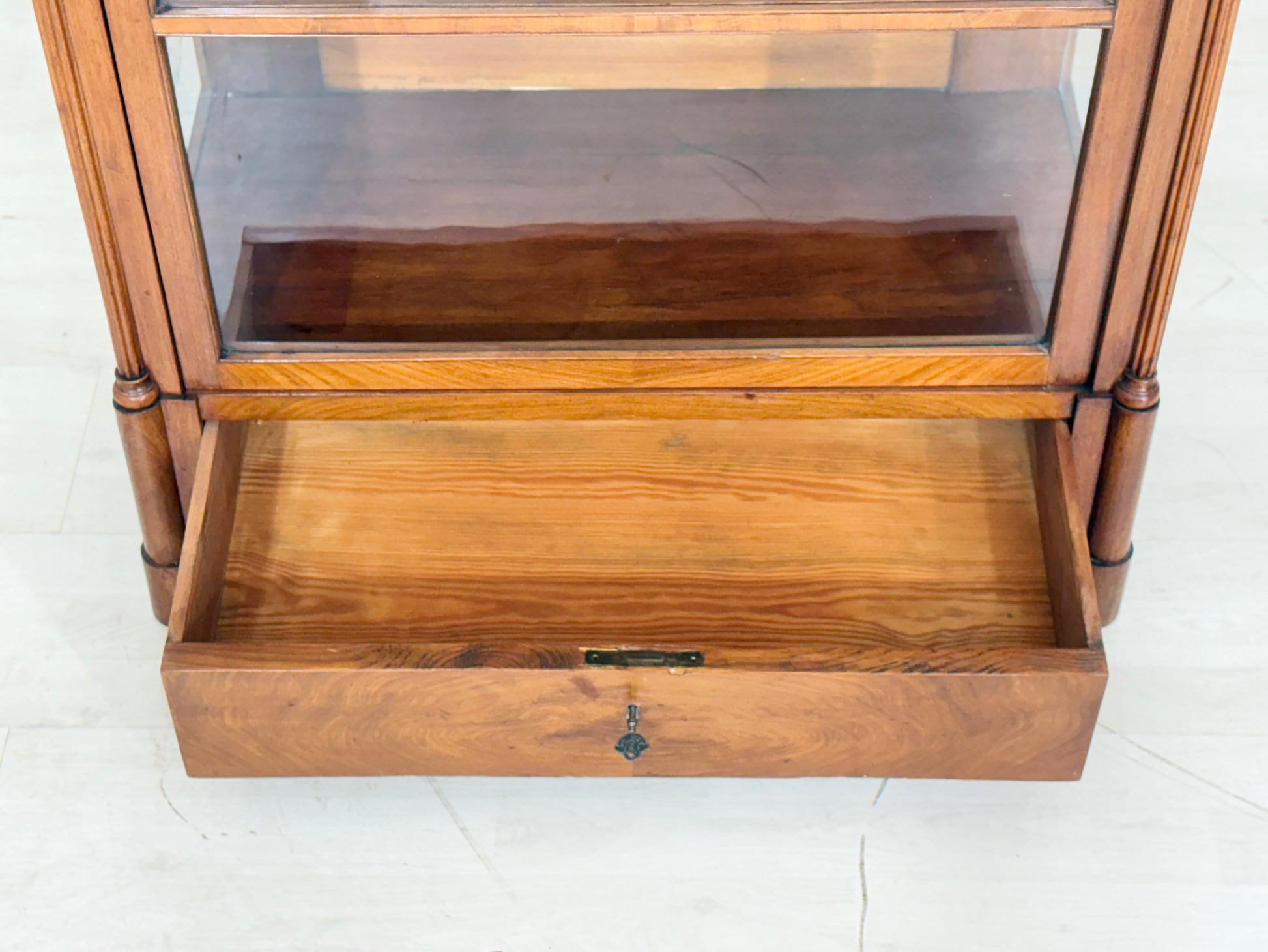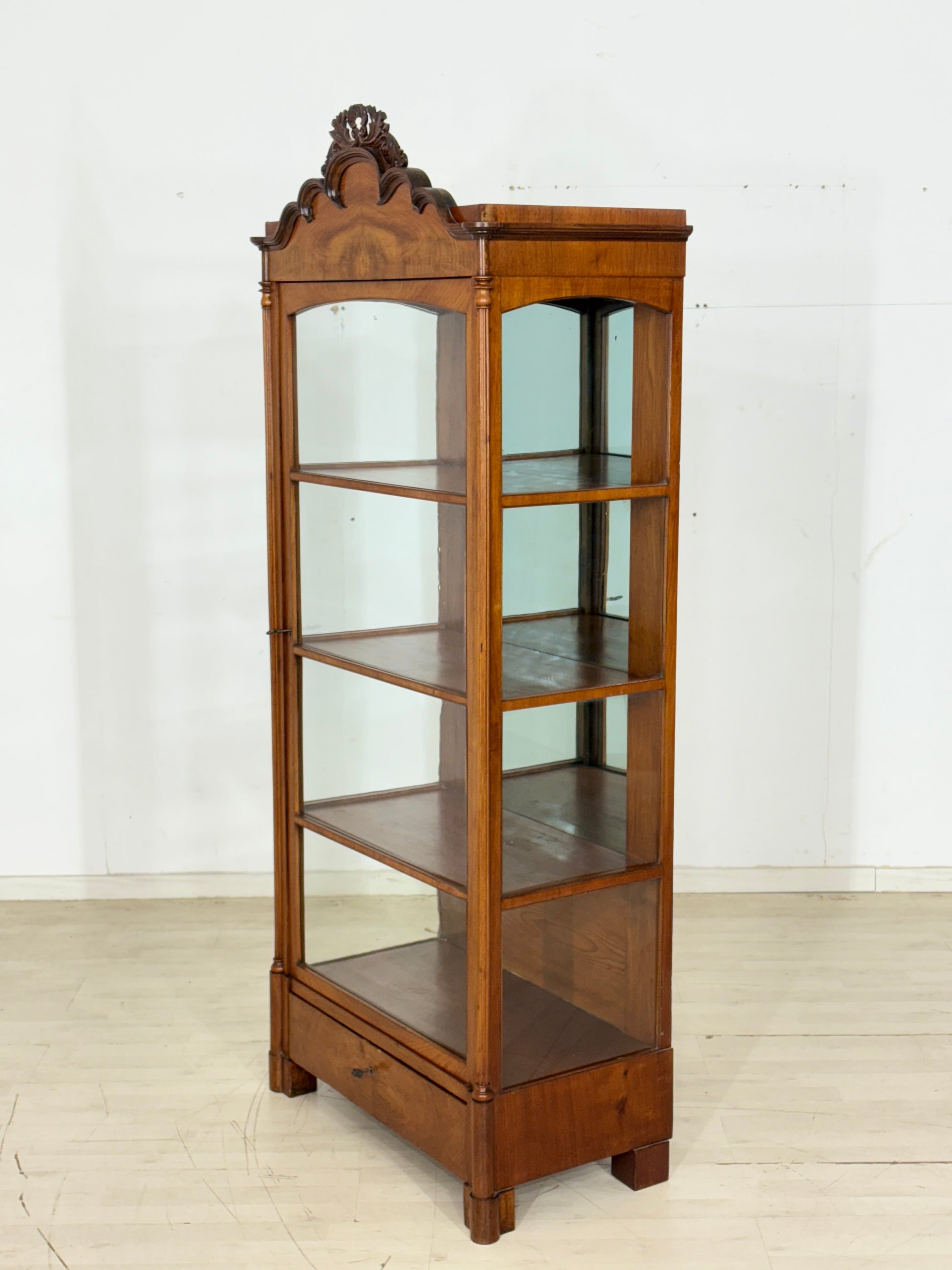 Zum Verkauf steht eine sehr schöne, antike Biedermeier Vitrine aus der Zeit um 1880. Das Möbelstück befindet sich in einem guten, wohnfertigen Zustand und besticht durch liebevolle Handarbeit und feine Stuckverzierungen im Kopfbereich. Das untere Schloss ist leider ohne Funktion, was die Gebrauchstauglichkeit des Schrankes jedoch nicht beeinträchtigt.