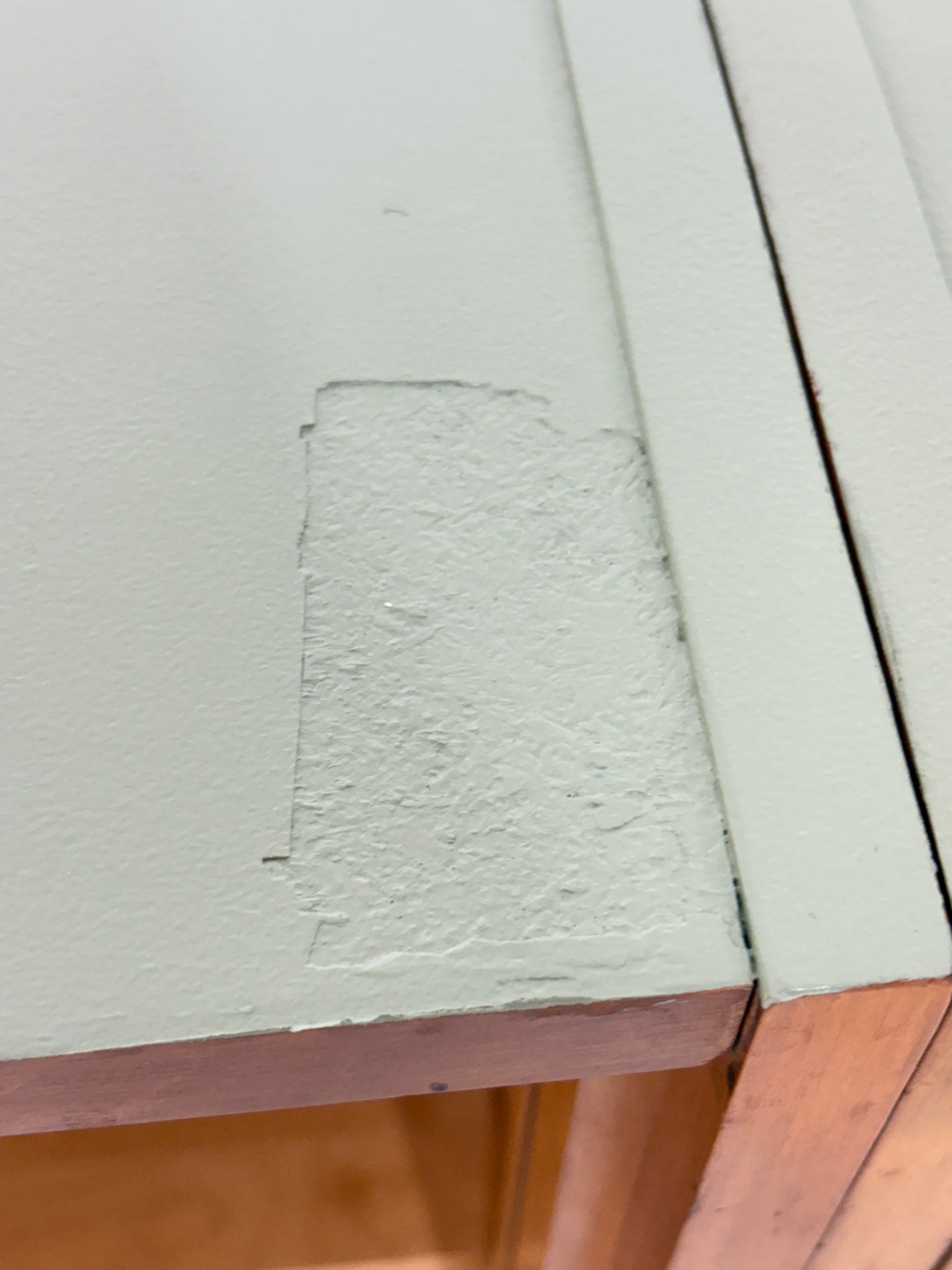 Da die Oberplatte deutliche Gebrauchsspuren aufwies, haben wir sie sorgfältig abgeschliffen und mit einer edlen Vintage-Grün-Farbe neu behandelt.