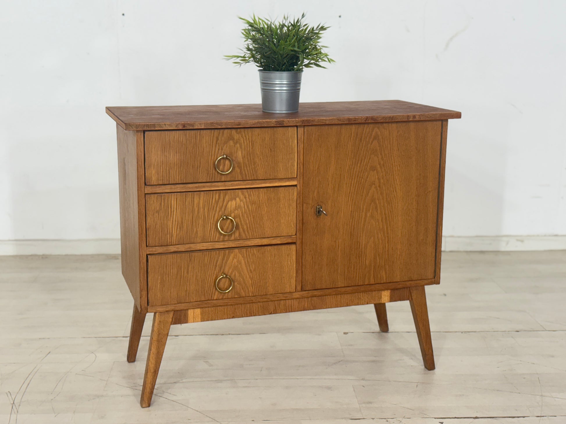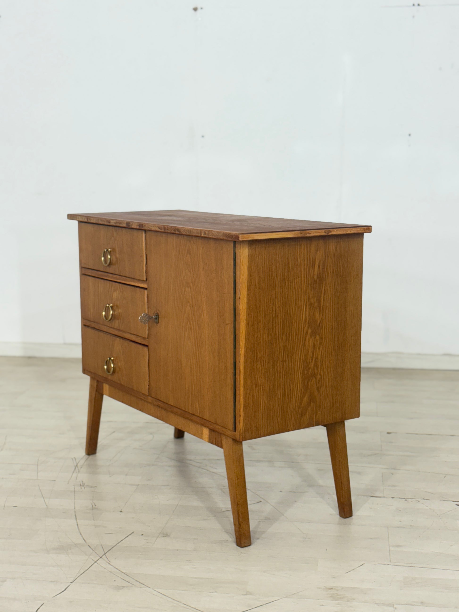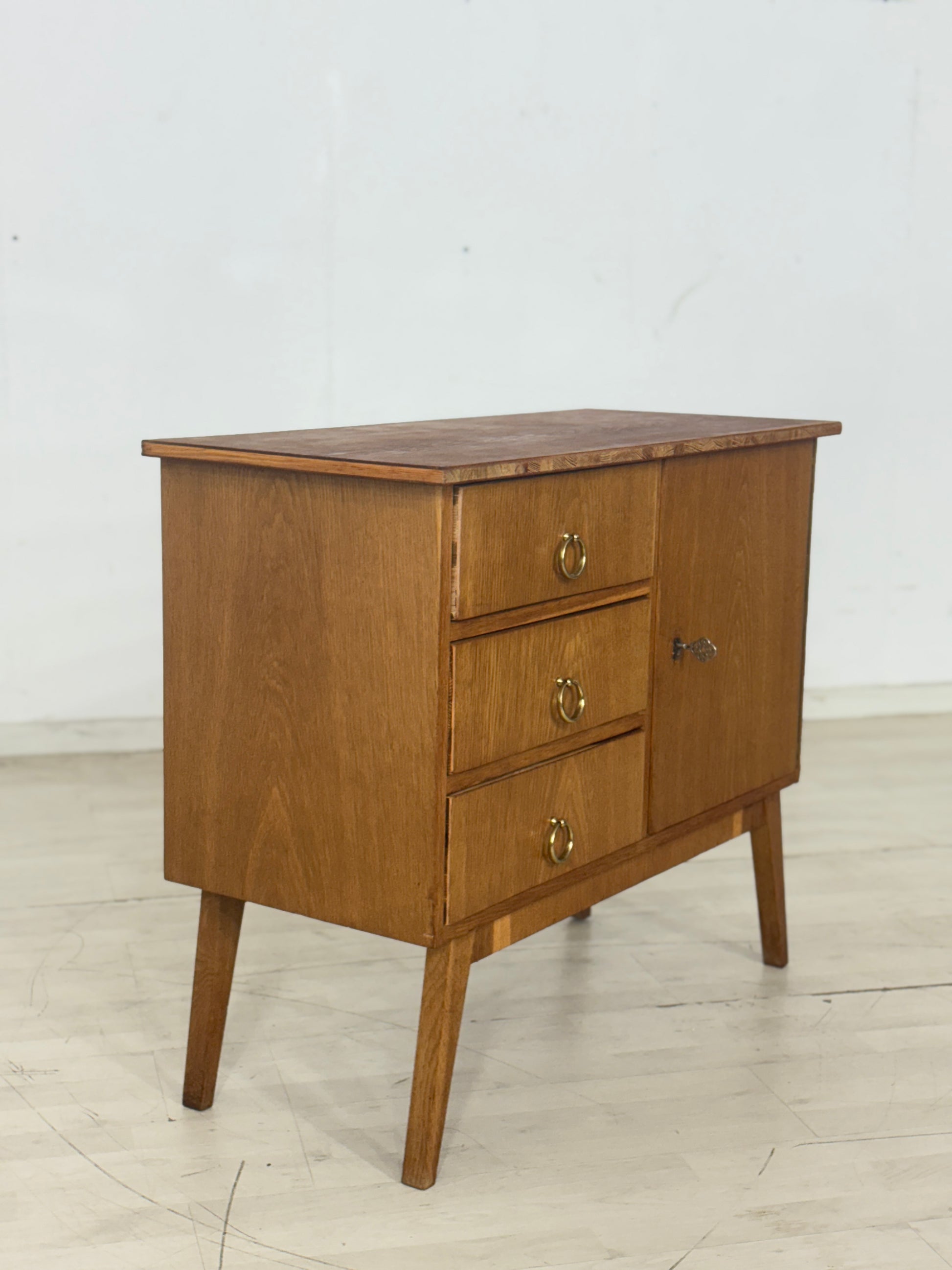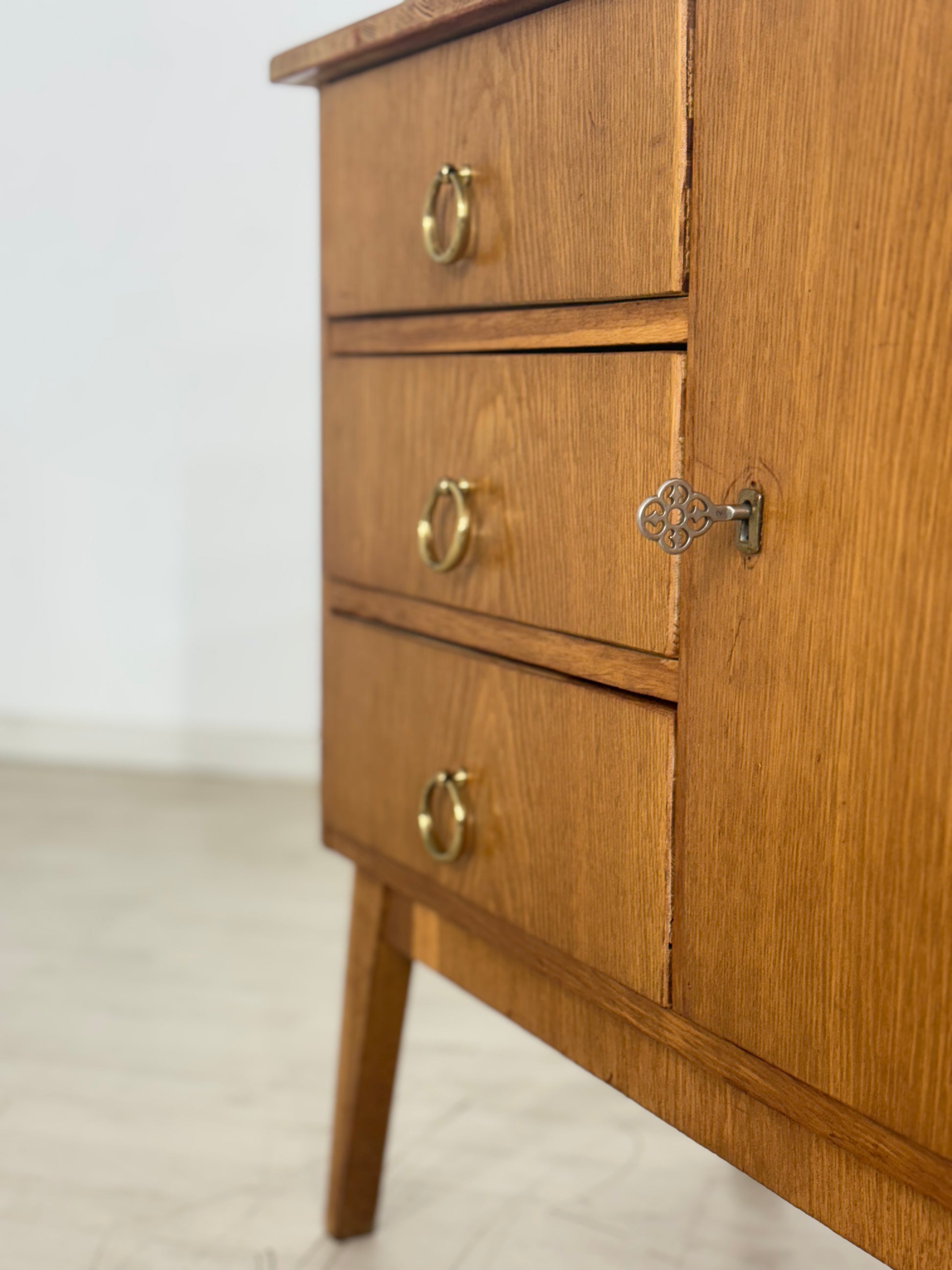 Zum verkauf steht eine niedliche Kommode aus den 60er Jahren in einem guten Zustand. Die Oberplatte wurde von uns geschliffen und mit Öl behandelt. Durch seine schlichte Messing Griffe verleiht die Kommode niedliche Ausstrahlung und passt gut ins Wohnzimmer oder in den Flur.