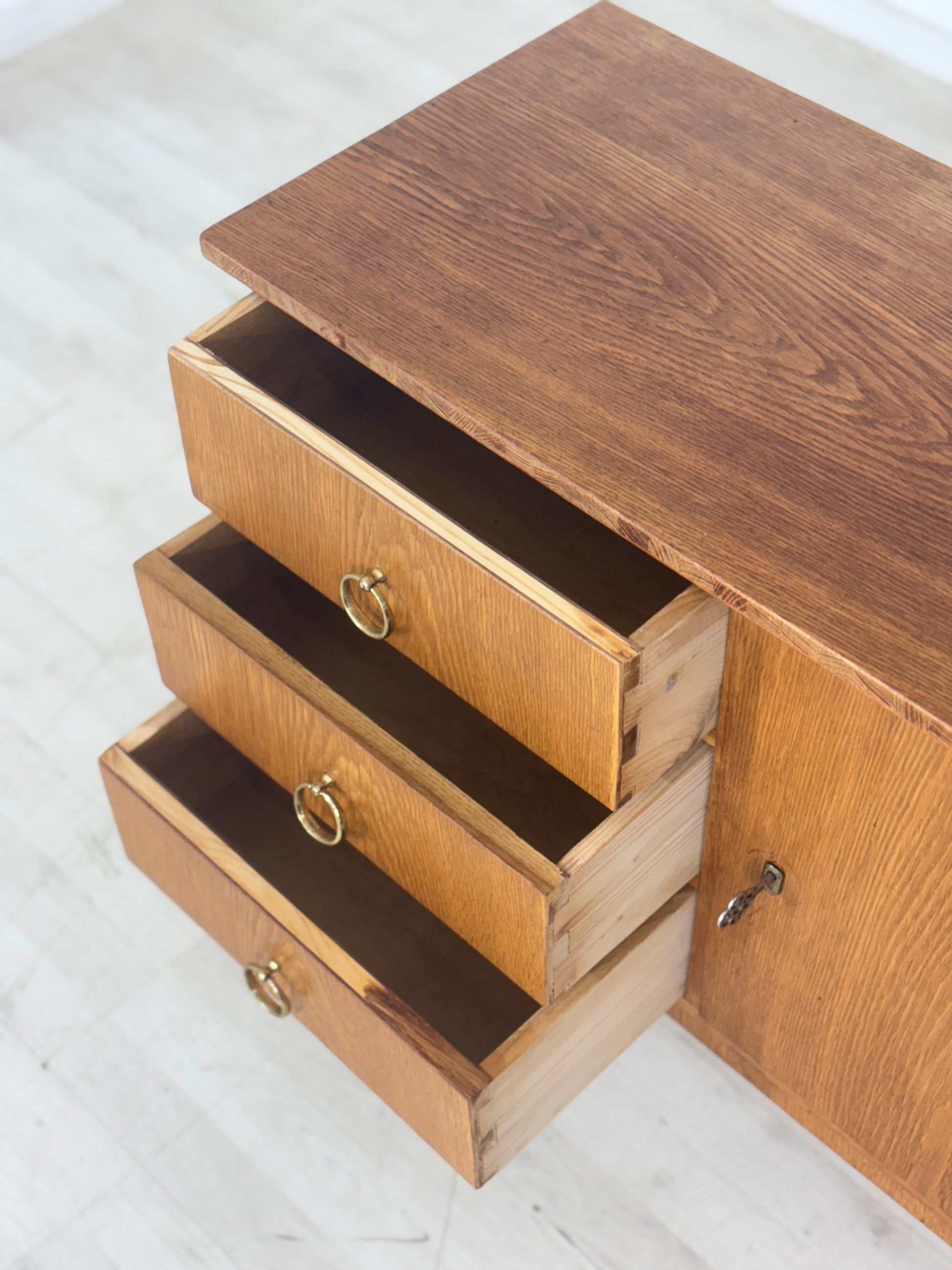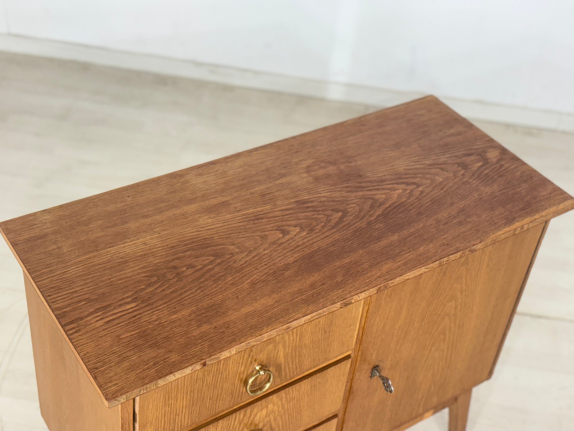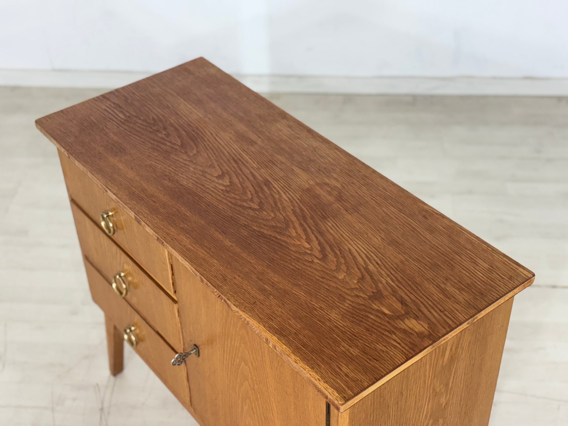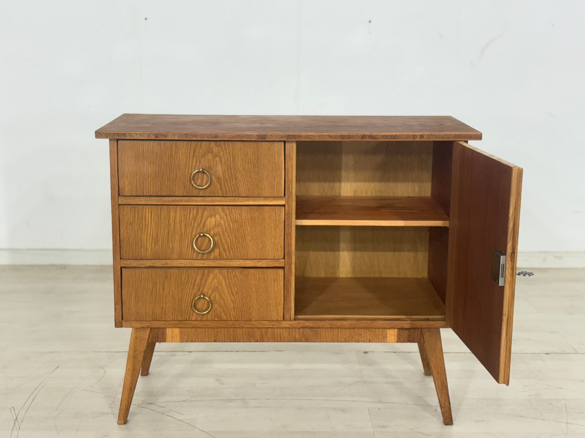 Zum verkauf steht eine niedliche Kommode aus den 60er Jahren in einem guten Zustand. Die Oberplatte wurde von uns geschliffen und mit Öl behandelt. Durch seine schlichte Messing Griffe verleiht die Kommode niedliche Ausstrahlung und passt gut ins Wohnzimmer oder in den Flur.