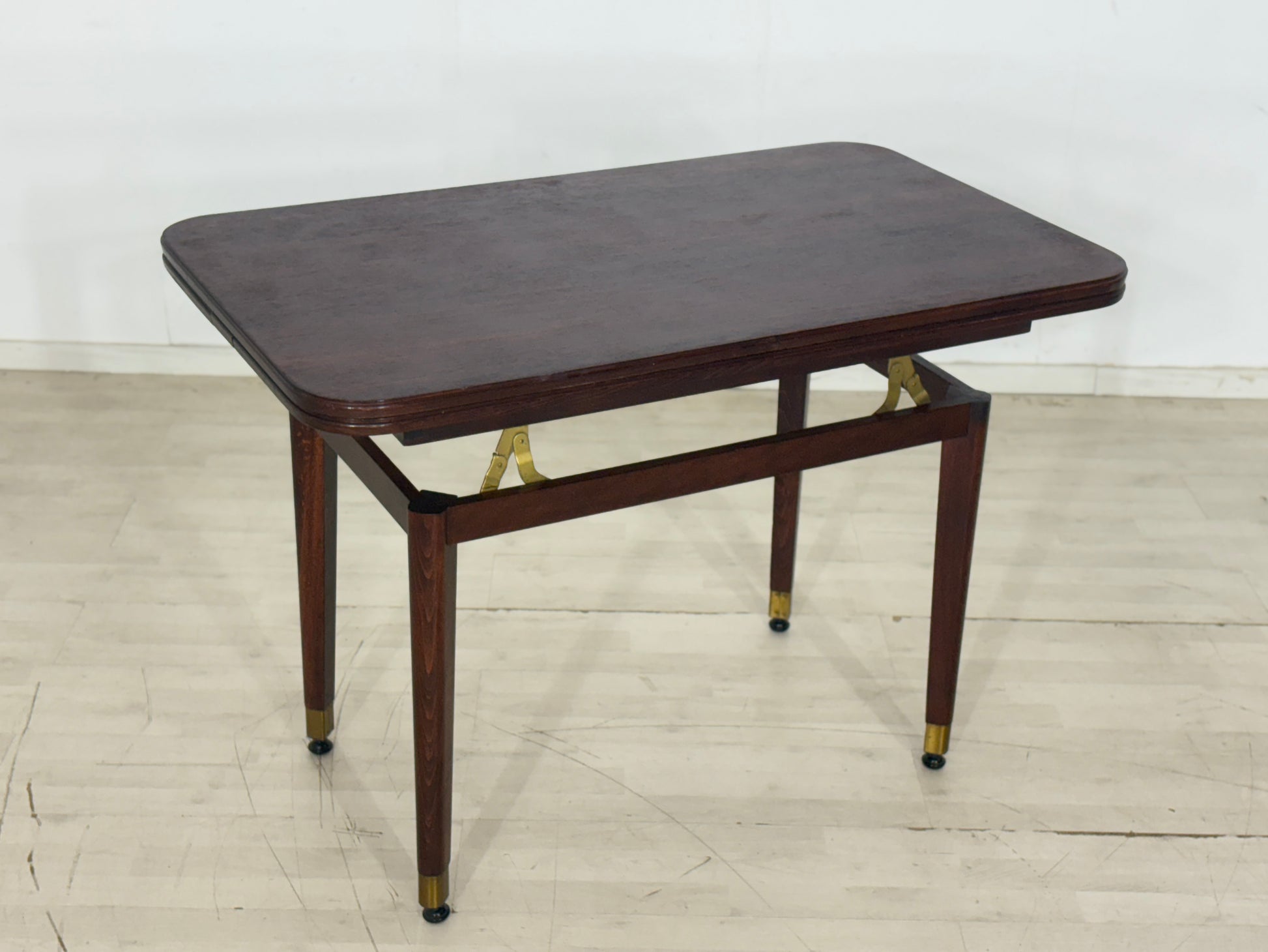 Die filigranen Beine mit eleganten Messing-Enden verleihen dem Tisch eine edle Note. Die Oberfläche wurde von uns frisch geschliffen und geölt, sodass sie wieder in neuem Glanz erstrahlt. Ein perfekter Tisch für die Küche, der Retro-Charme mit modernem Komfort verbindet.
