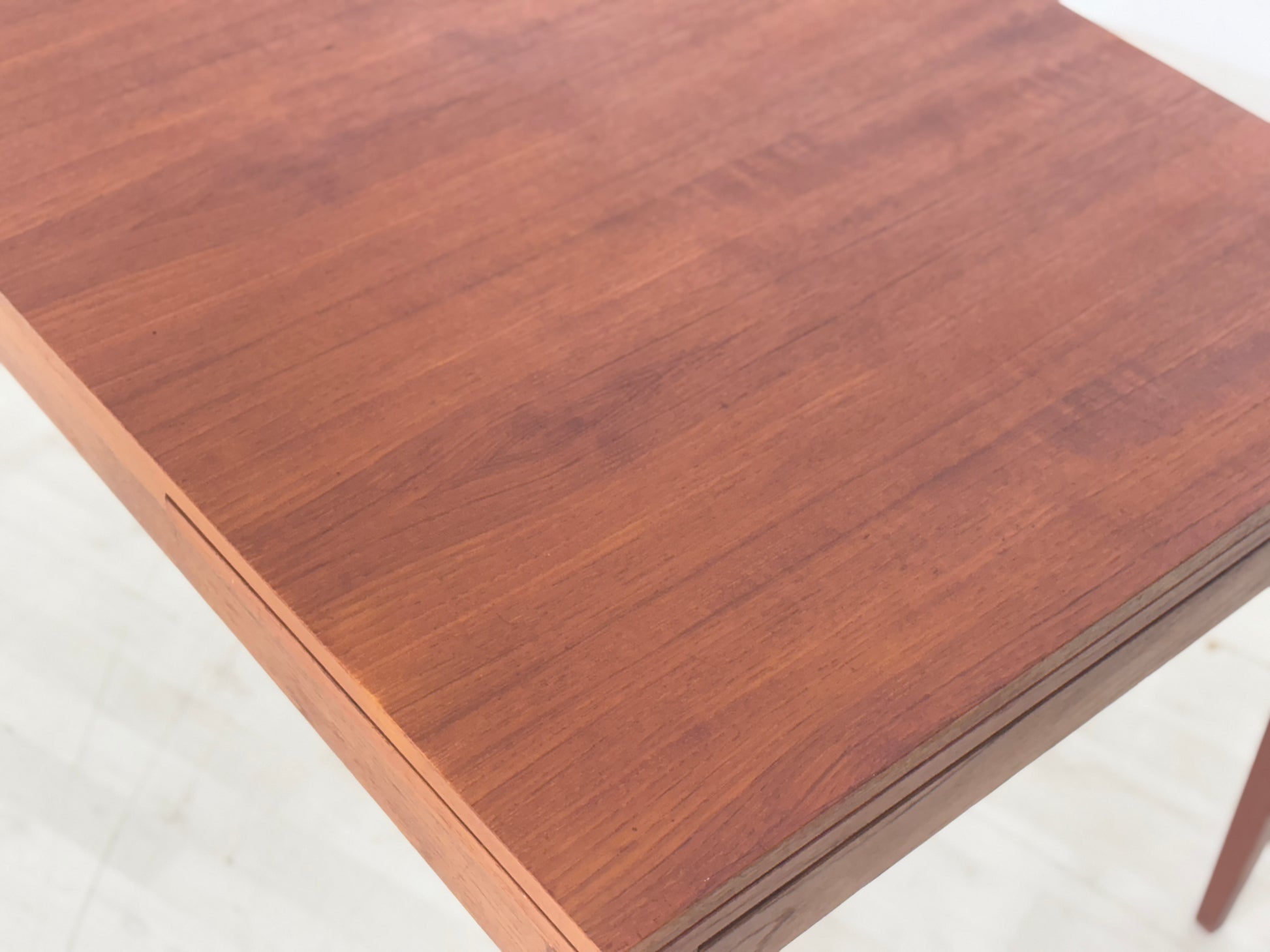 Zum Verkauf steht ein wunderschöner, ausziehbarer Vintage Esstisch aus den 1960er Jahren. Die Tischplatten wurden von uns sorgfältig geschliffen und mit hochwertigem Teak-Öl behandelt, um ihre natürliche Schönheit hervorzuheben. Sein schlichtes und zeitloses Design macht ihn zu einem perfekten Begleiter für jedes Esszimmer und verleiht dem Raum eine warme, einladende Atmosphäre.