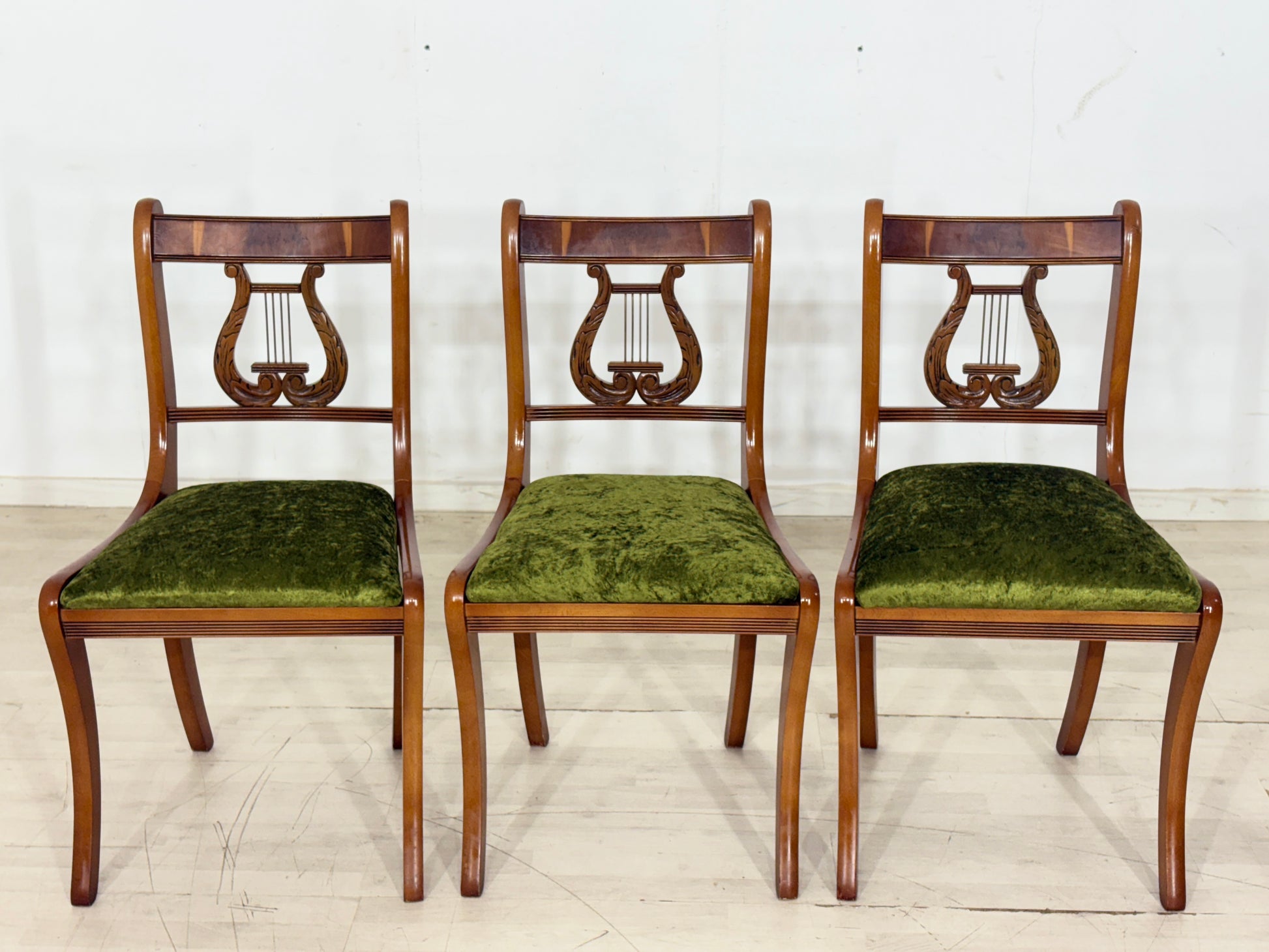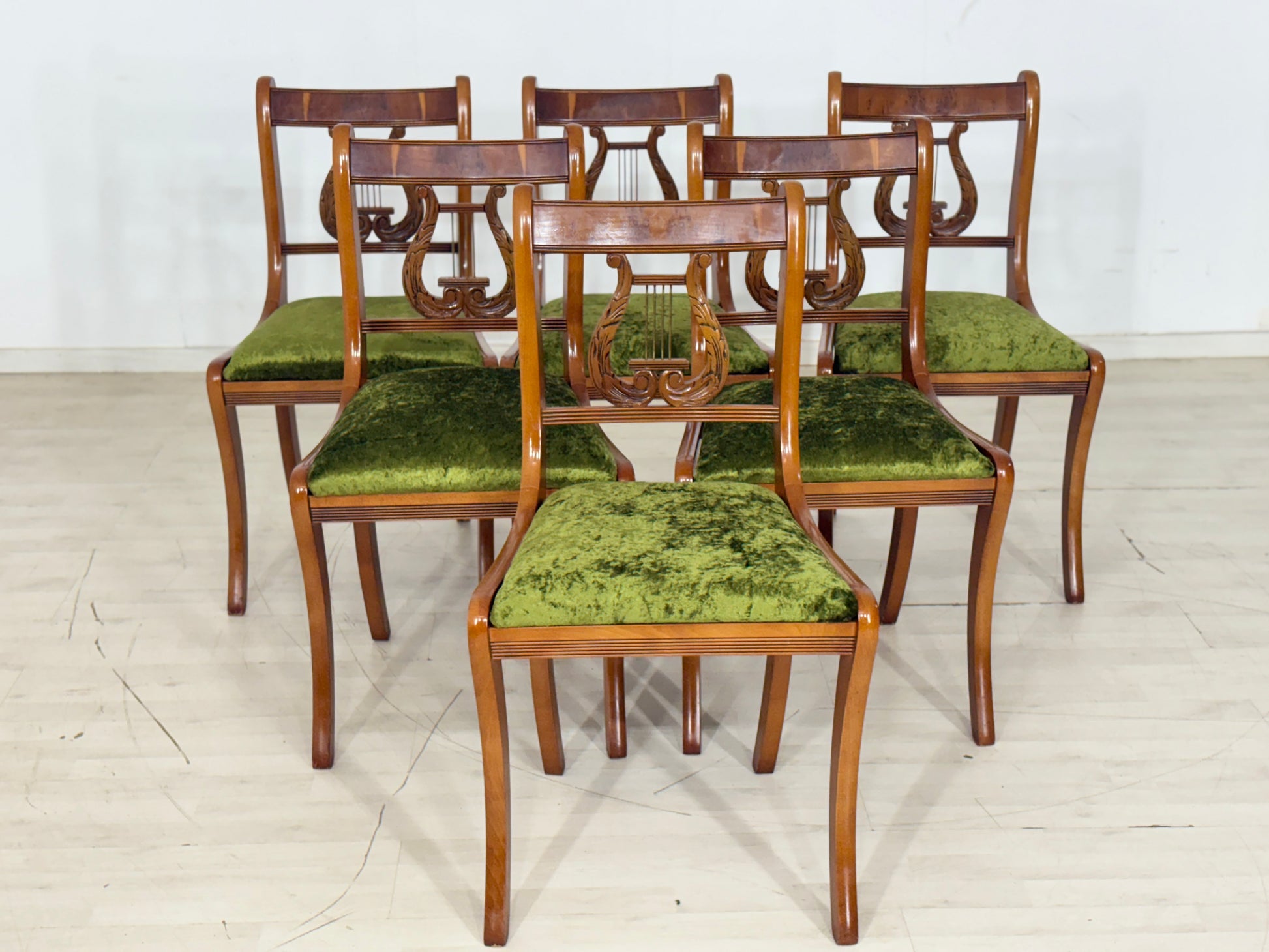 Zum Verkauf steht ein elegantes Set von sechs englischen Mahagoni-Stühlen im Regency-Stil. Die Stühle befinden sich in einem sehr guten Zustand. Der hochwertige Bezug und die Polsterung wurden von uns frisch erneuert/neu bezogen.