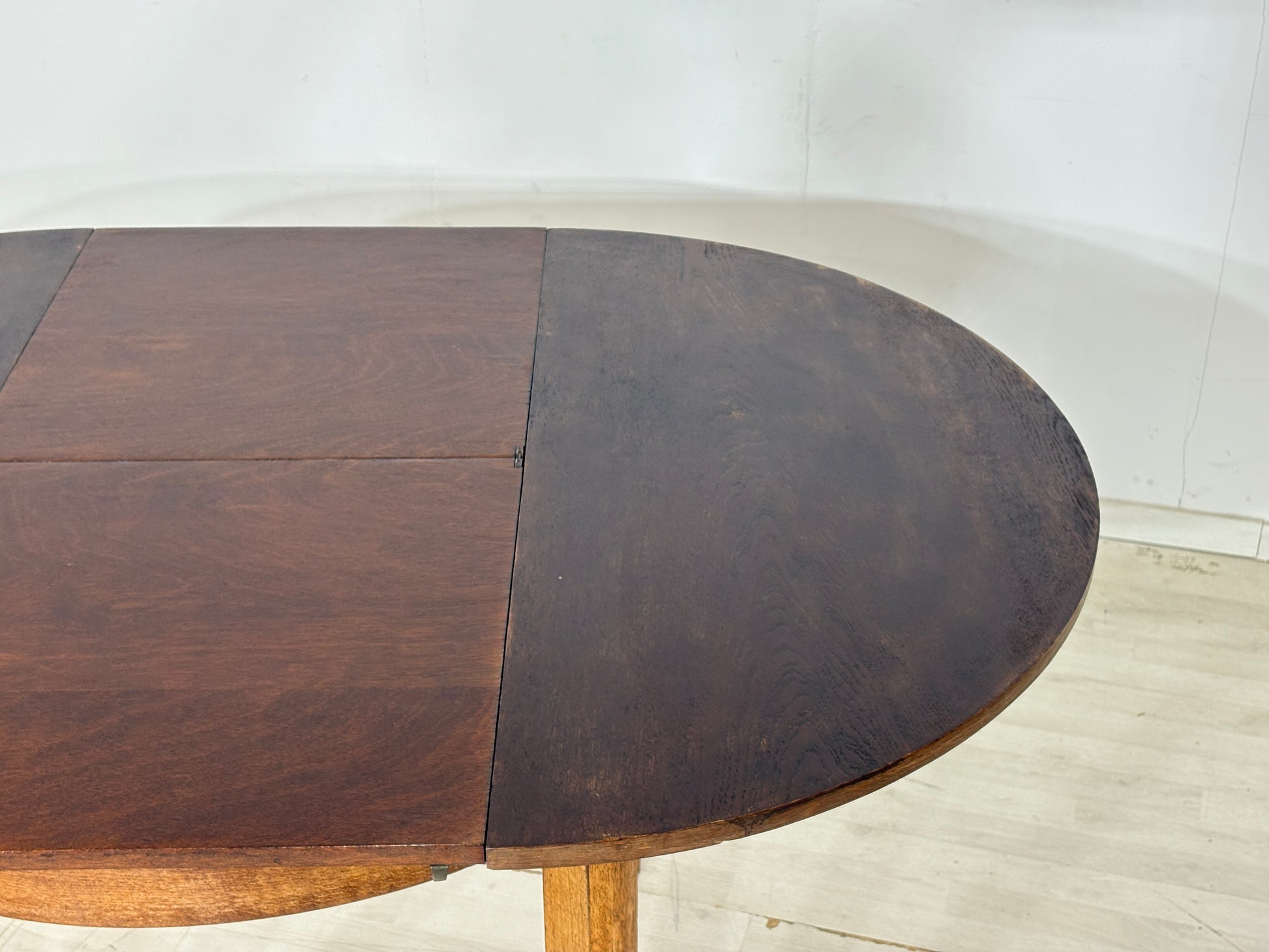 Die runde Oberplatte wurde geschliffen, gebeizt und mit Klarlack versiegelt. Dank Ausziehfunktion lässt sich der Tisch flexibel erweitern und bietet zusätzlichen Platz.
