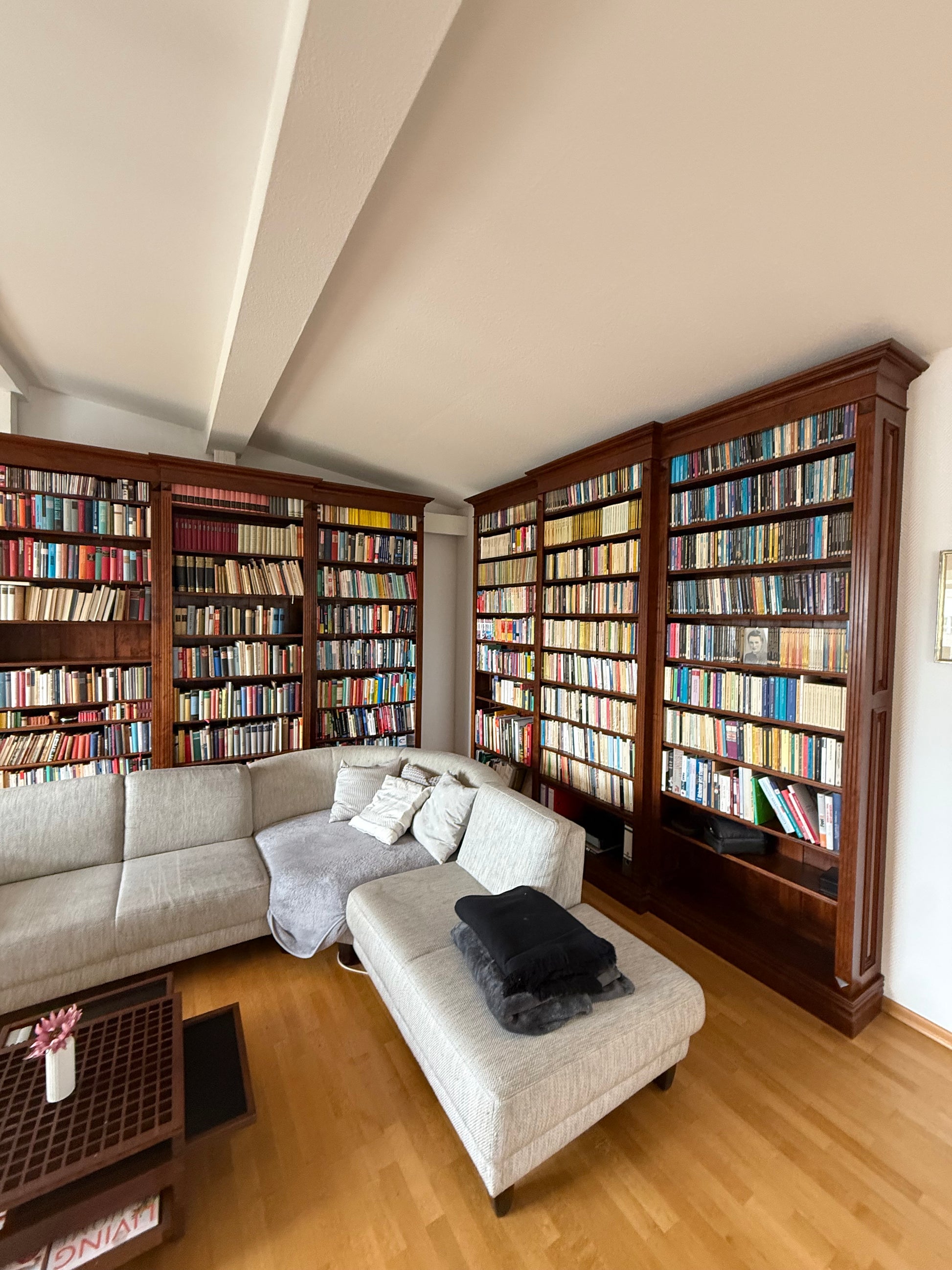 Zum Verkauf steht ein imposantes, Bücherregal (Bücherwand) aus massivem Holz mit einer warmen, attraktiven Farbgebung. Das Möbelstück wurde in den 1950er oder 1960er Jahren als hochwertige Reproduktion im klassischen Gründerzeit-Stil gefertigt und besticht durch saubere Verarbeitung und stabile Qualität.