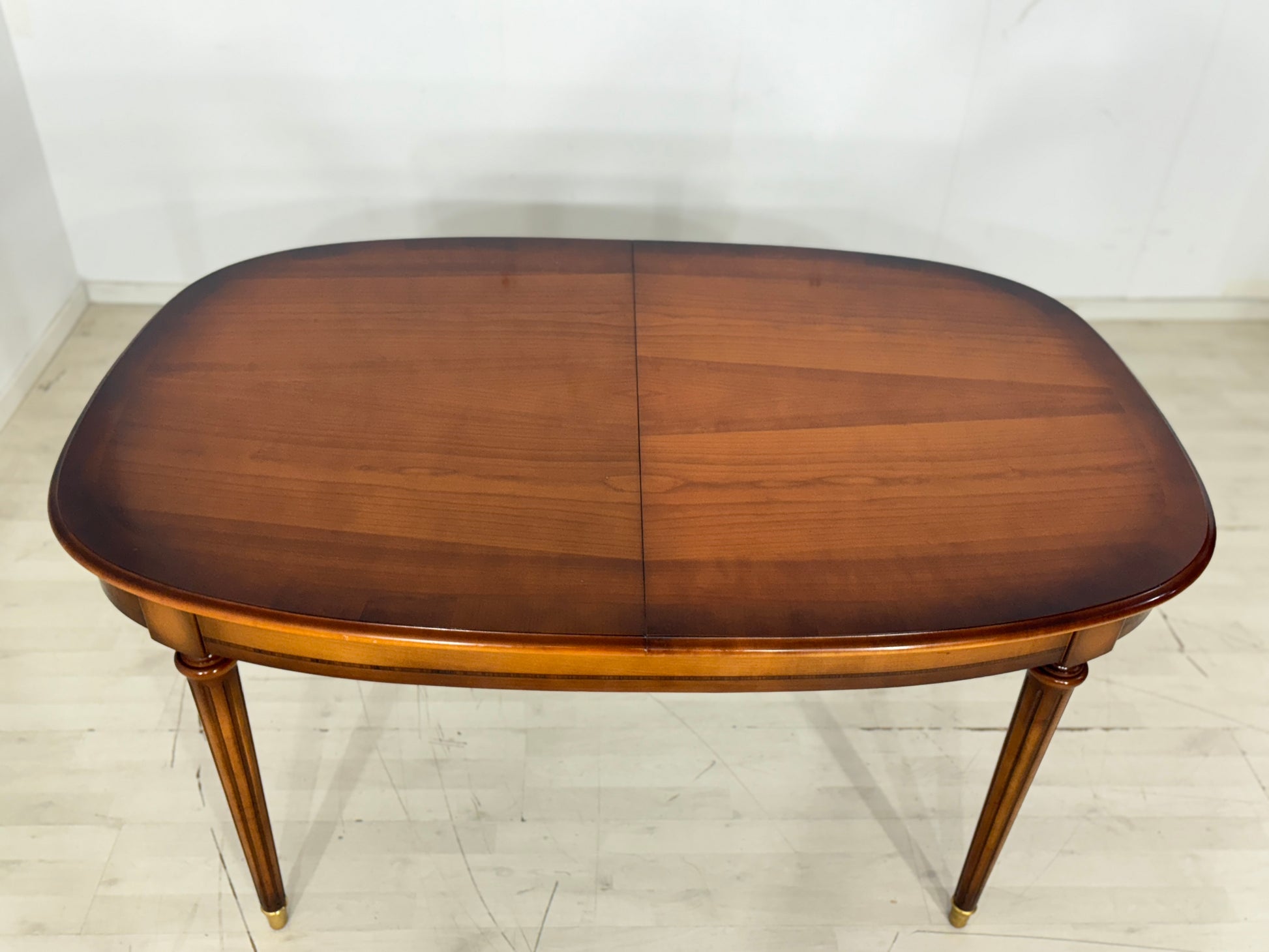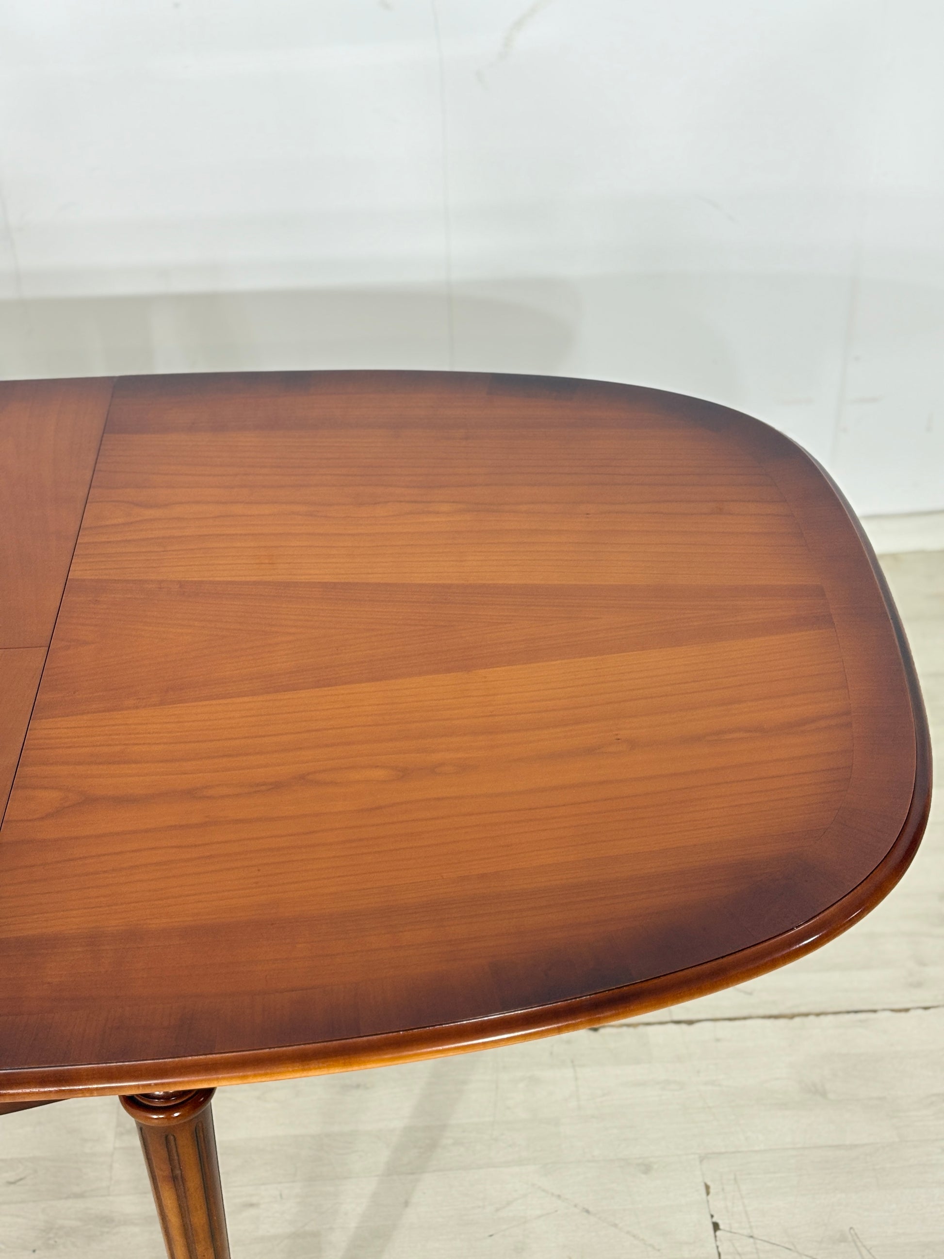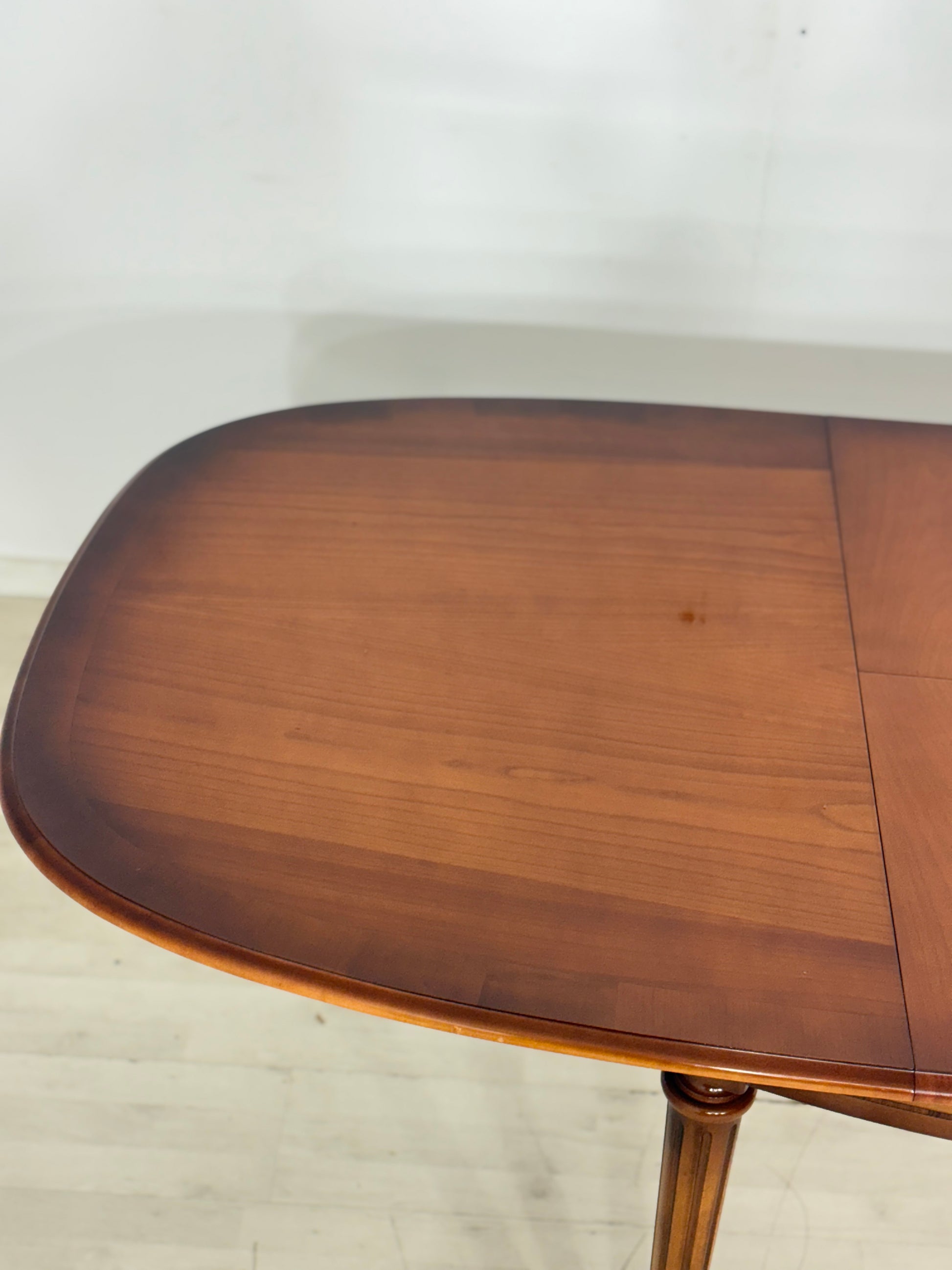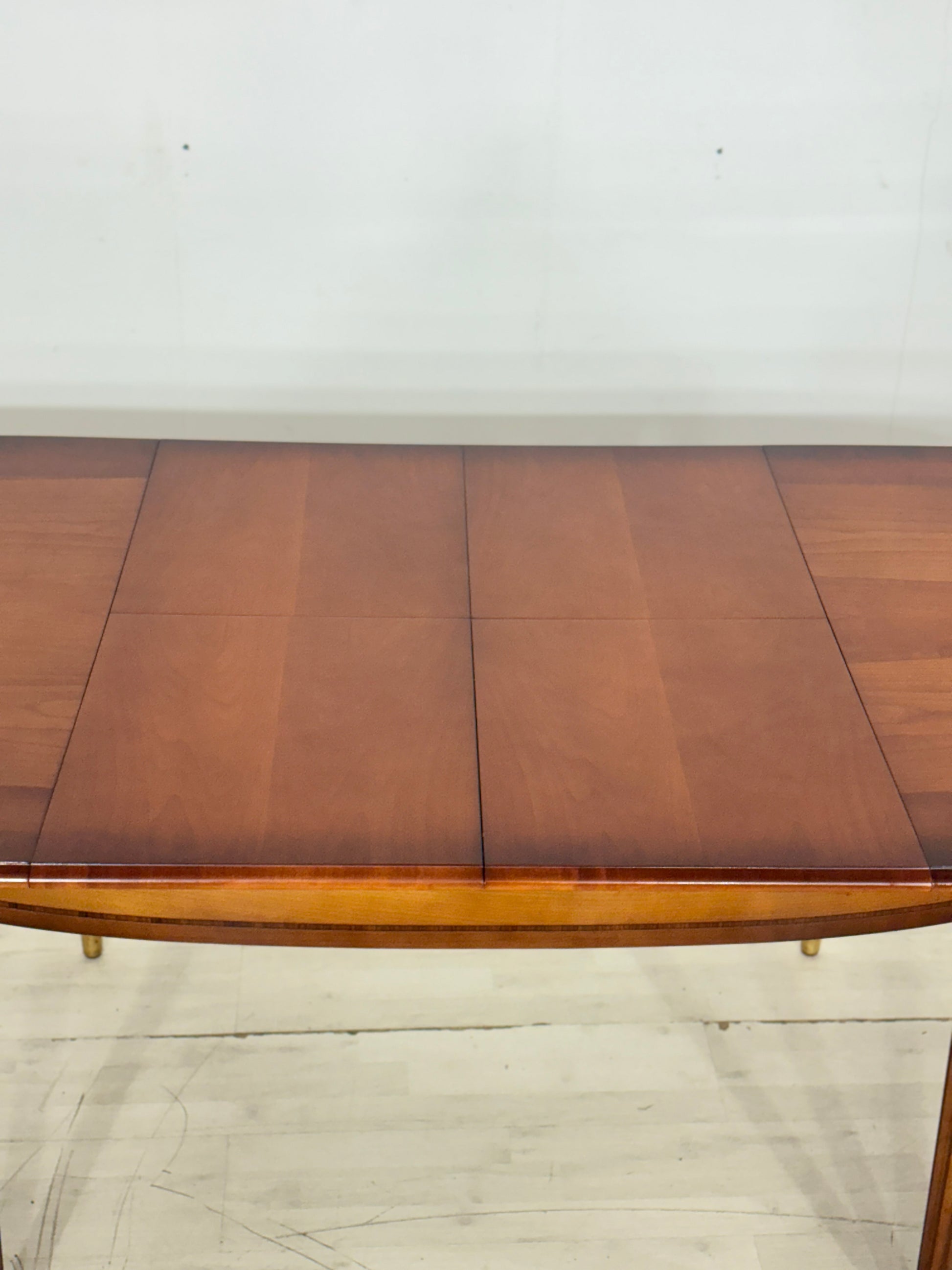 Zum Verkauf steht ein eleganter Esstisch der Premium-Marke Warrings, der durch seine erstklassige handwerkliche Verarbeitung besticht. Der Tisch ist aus edlem Kirschholz gefertigt und überzeugt durch seine zeitlose, ovale Form sowie die charakteristischen kannelierten Beine mit edlen Messingabschlüssen. Ein besonderes Merkmal ist die hohe Flexibilität, da sich der Tisch durch praktische Einlegeplatten im Handumdrehen vergrößern lässt und somit ideal für festliche Anlässe geeignet ist. Das Möbelstück befindet sich in einem sehr gepflegten Zustand und zeigt eine wunderschöne, warme Holzmaserung.