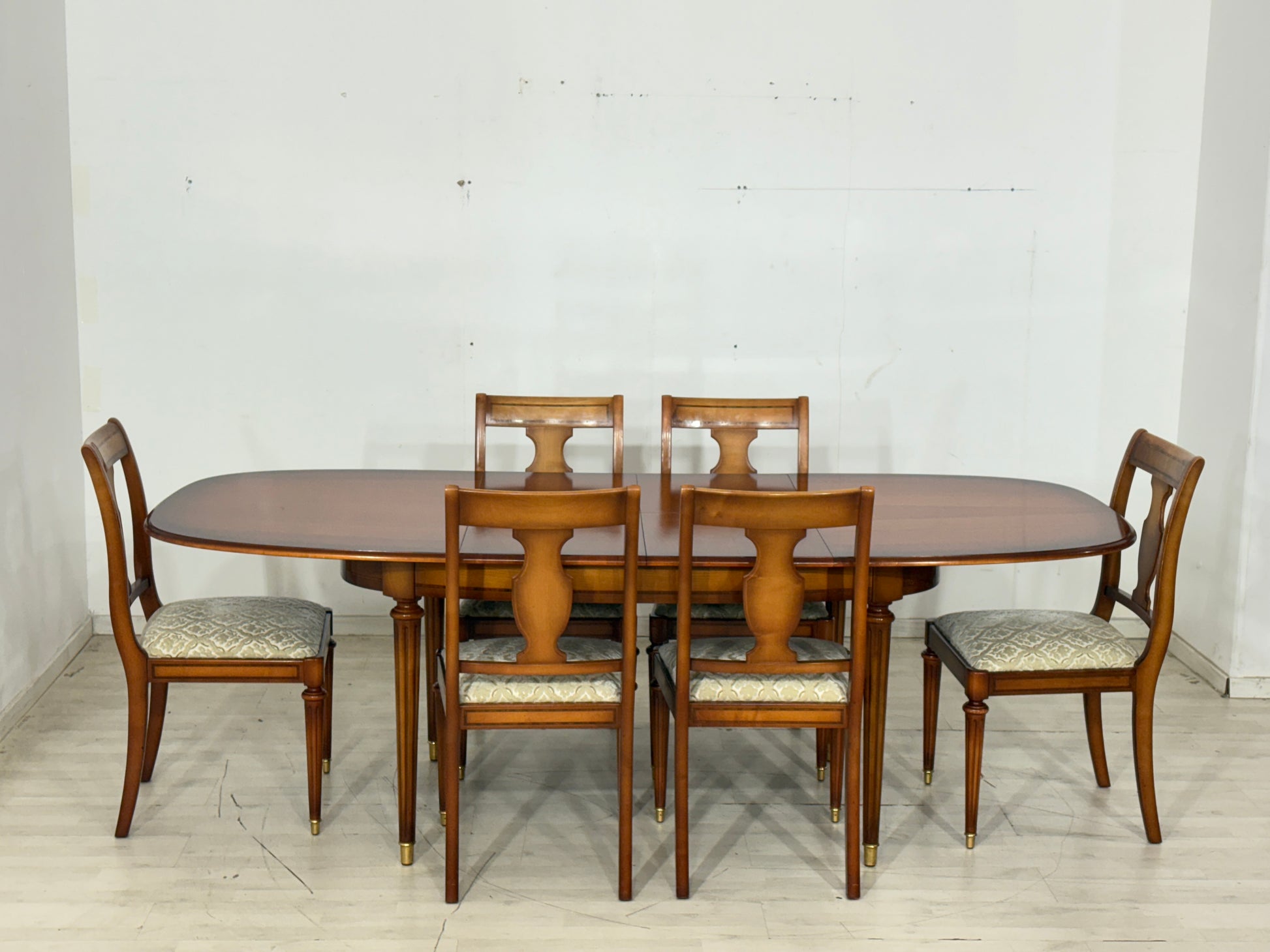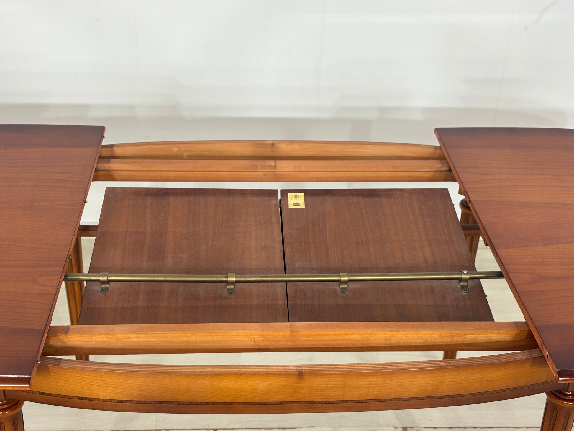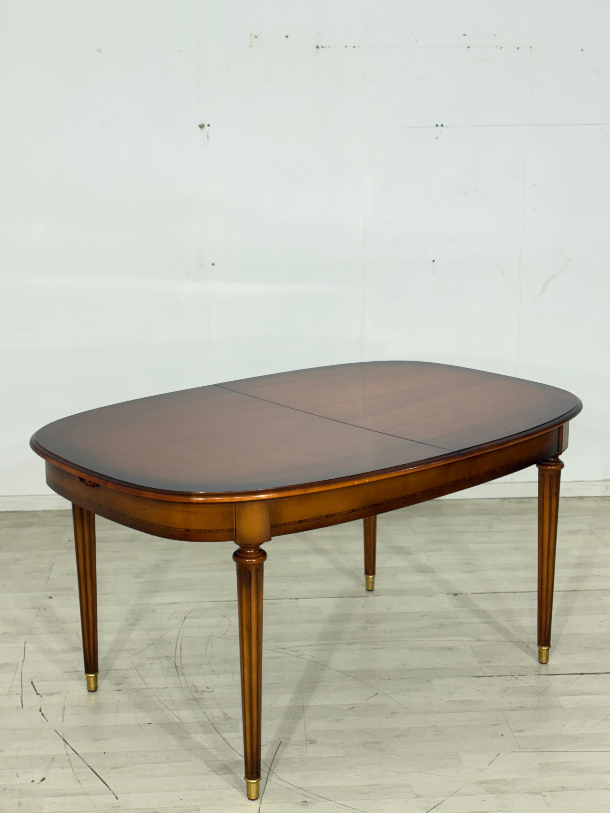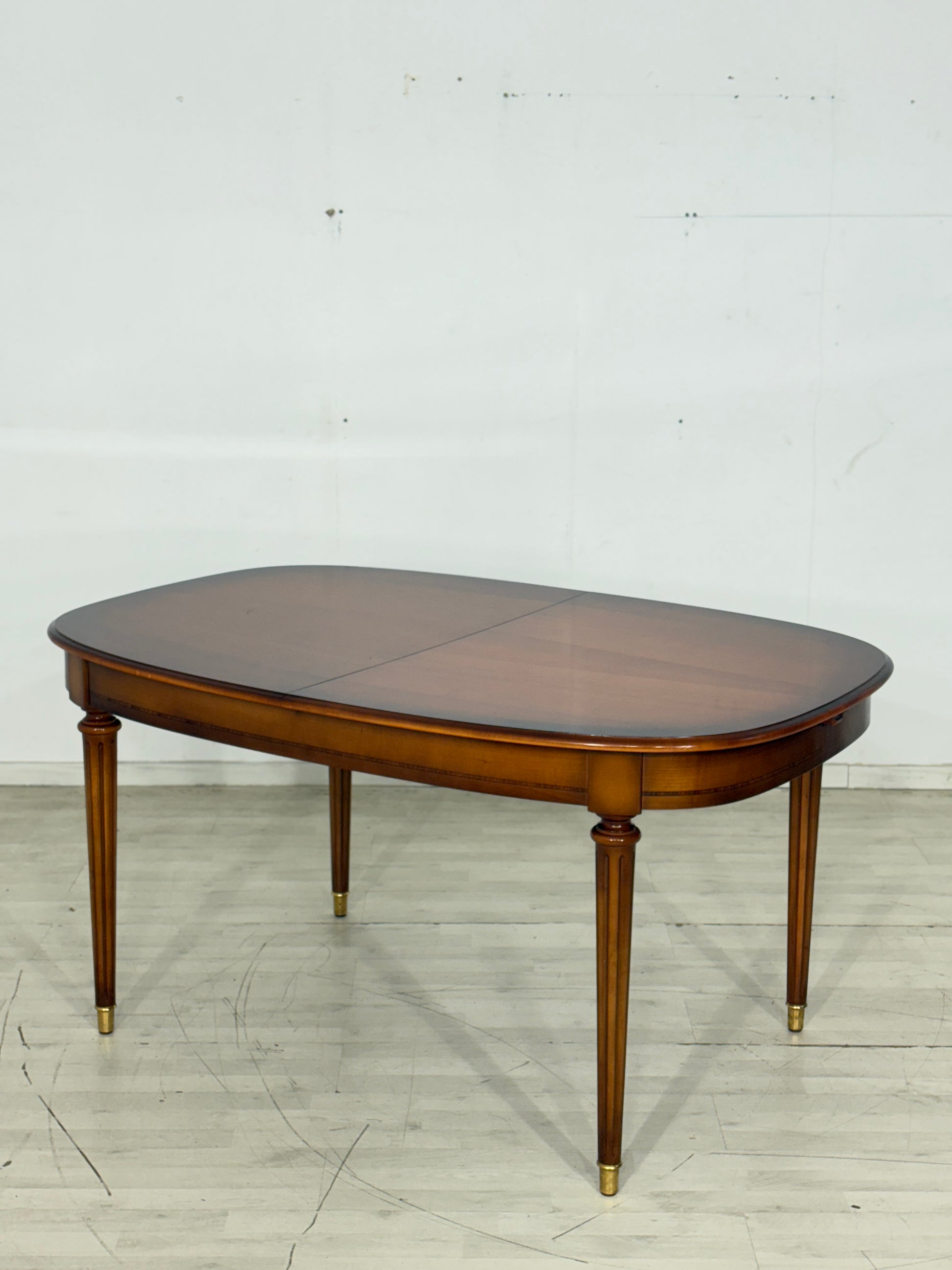 Zum Verkauf steht ein eleganter Esstisch der Premium-Marke Warrings, der durch seine erstklassige handwerkliche Verarbeitung besticht. Der Tisch ist aus edlem Kirschholz gefertigt und überzeugt durch seine zeitlose, ovale Form sowie die charakteristischen kannelierten Beine mit edlen Messingabschlüssen. Ein besonderes Merkmal ist die hohe Flexibilität, da sich der Tisch durch praktische Einlegeplatten im Handumdrehen vergrößern lässt und somit ideal für festliche Anlässe geeignet ist. Das Möbelstück befindet sich in einem sehr gepflegten Zustand und zeigt eine wunderschöne, warme Holzmaserung.