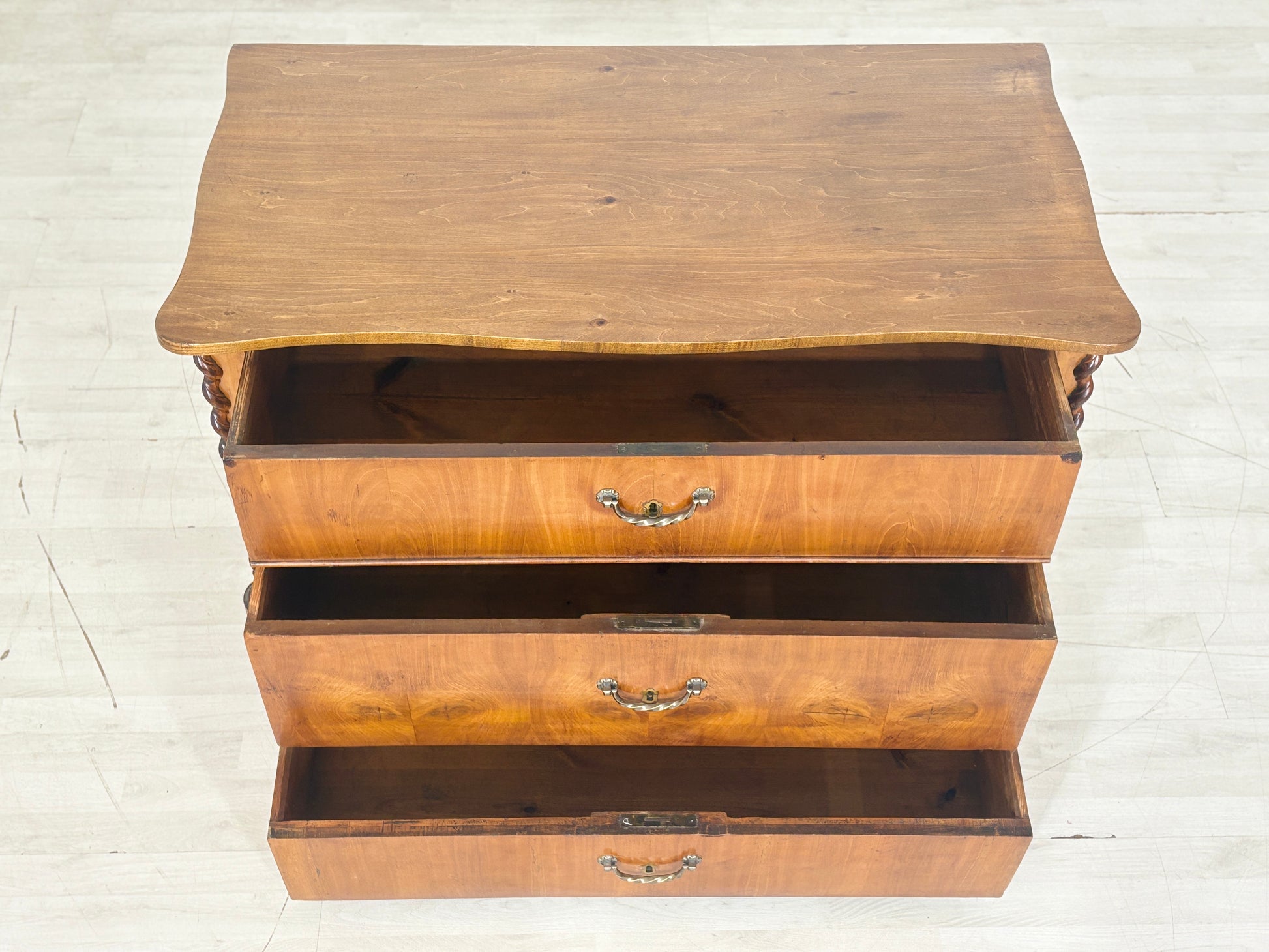 Zum Verkauf steht eine sehr schöne Jugendstil-Kommode mit drei Schubfächern aus circa 1900. Die Schubfächer sind geräumig und wirken durch die eleganten Messinggriffe schlicht und stilvoll. Das Nussbaum zeigt eine wunderschöne Maserung und verleiht der Kommode eine warme, angenehme Ausstrahlung.