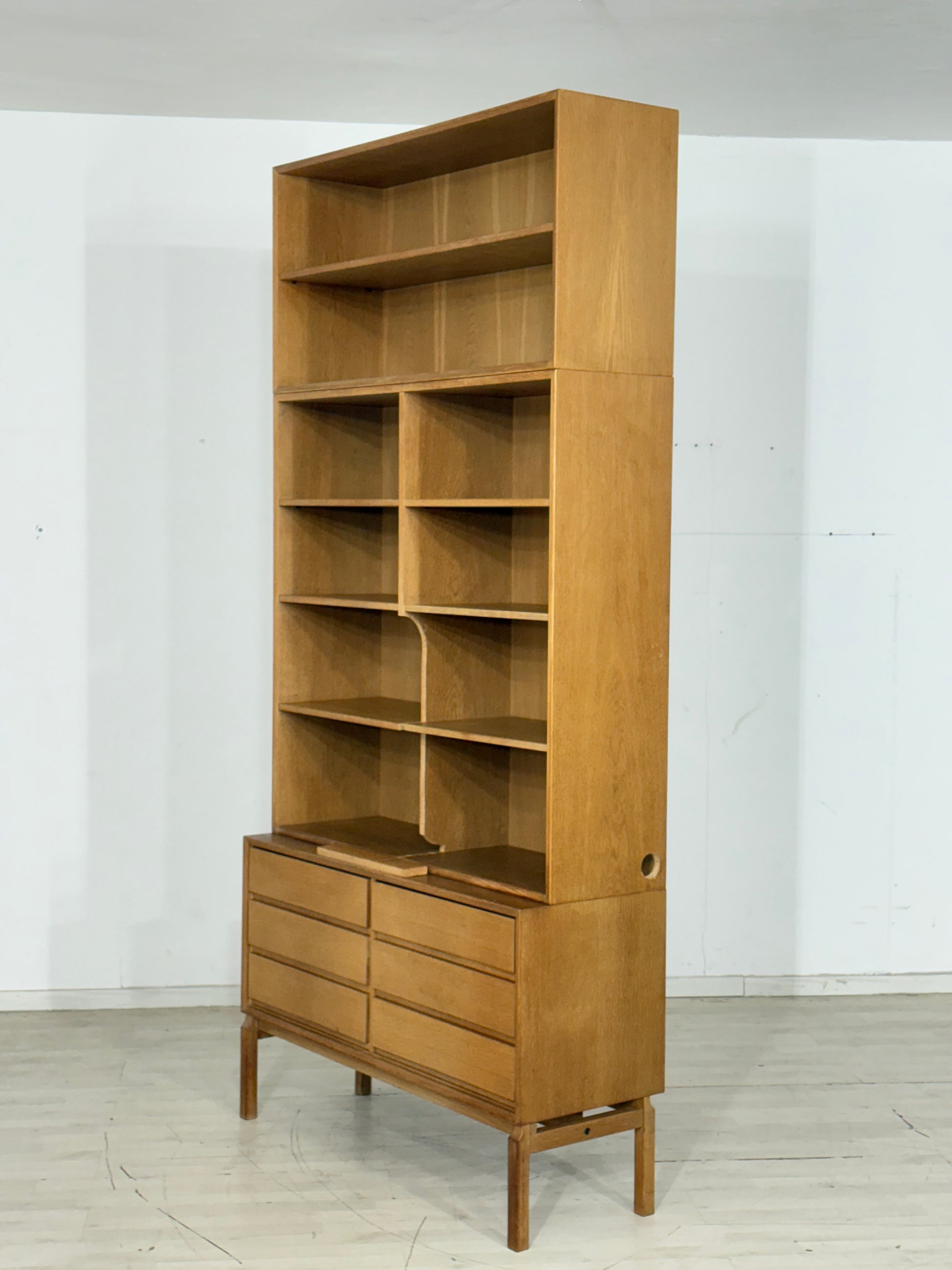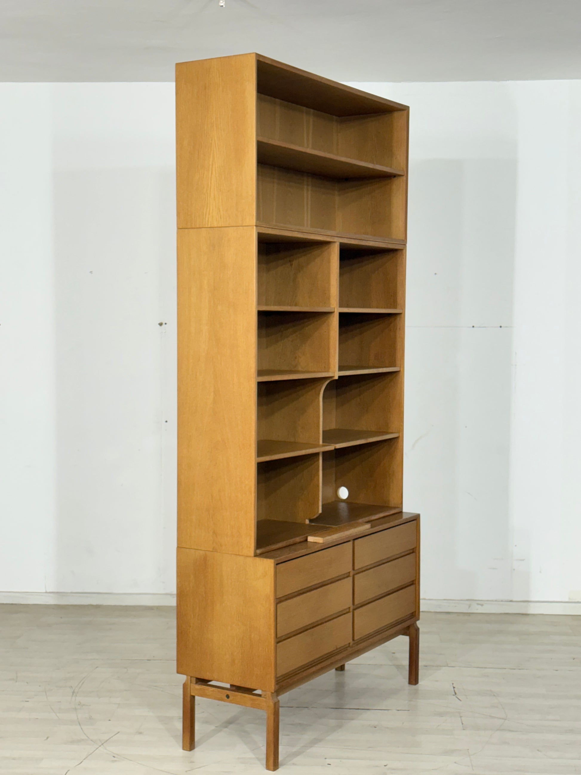 Zum Verkauf steht ein zeitlos schönes und dreiteiliges Vintage-Regalsystem aus der legendären MTP-Serie von IKEA, die in den 1960er und 70er Jahren nach dem Design von Marianne Richter gefertigt wurde. Dieses Set verkörpert den zeitlosen skandinavischen Mid-Century-Stil perfekt und besticht durch seine hochwertige Verarbeitung in warmem Eichenholz. Der modulare Aufbau besteht aus einem stabilen Unterteil mit sechs geräumigen Schubladen sowie zwei passgenauen Regalaufsätzen, die flexibel kombiniert werden können. Das Möbelstück befindet sich in einem sehr guten und gepflegten Vintage-Zustand mit einer authentischen Patina, die den Charakter dieses echten Sammlerstücks unterstreicht. Ein absolutes Highlight für Liebhaber von hochwertigem Design aus einer Ära, in der Langlebigkeit und Ästhetik bei IKEA noch an erster Stelle standen.