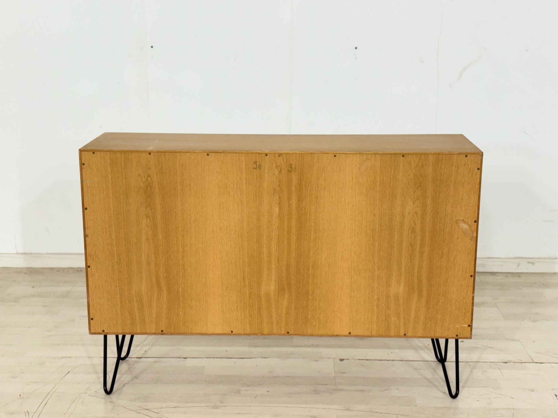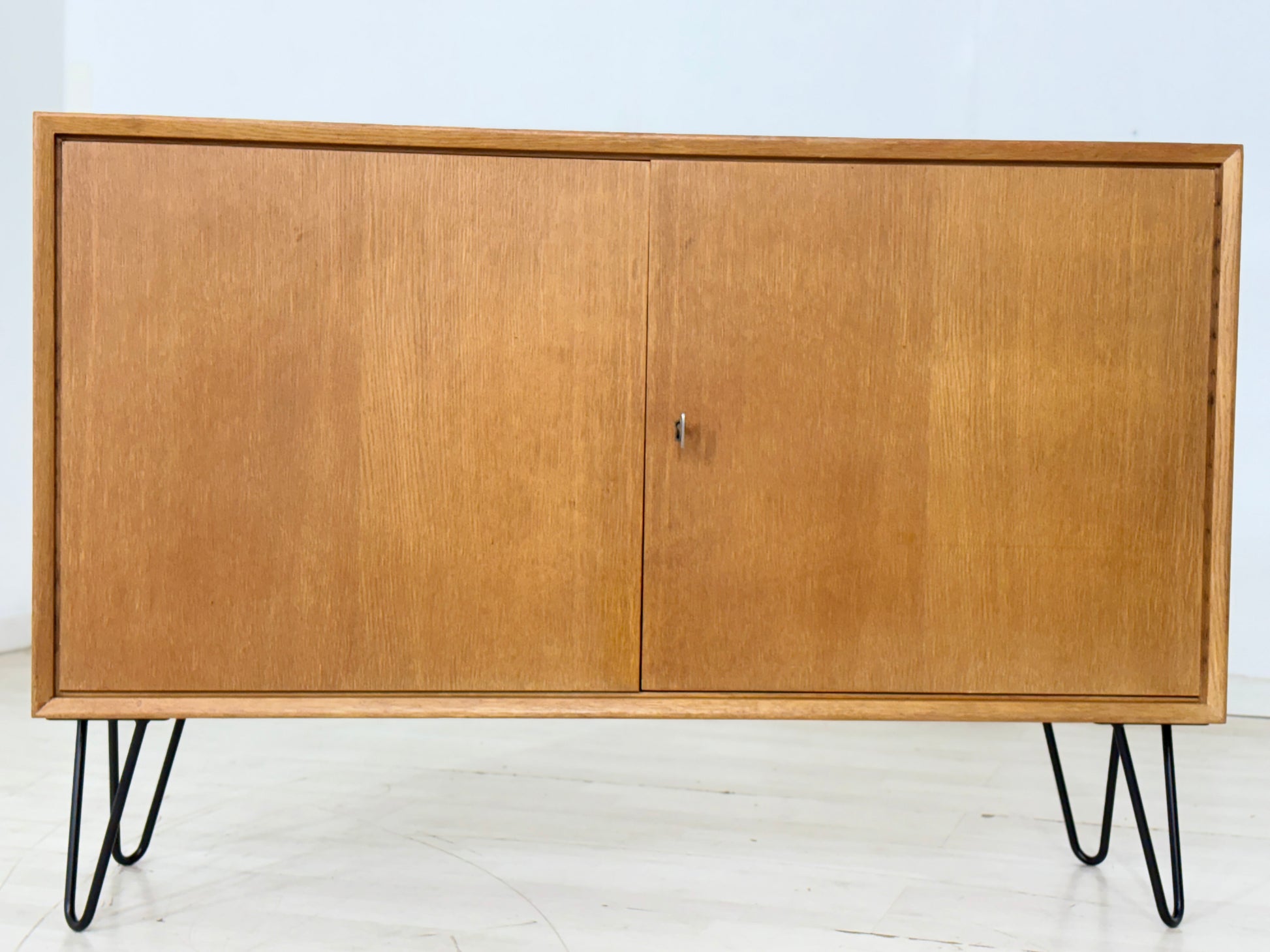 Wir haben dieses historische Stück behutsam restauriert und das wunderschöne Eichenholz neu aufbereitet, um seinen warmen, tiefen Charakter wieder voll zur Geltung zu bringen. Um dem zeitlosen Design eine moderne, luftige Leichtigkeit zu verleihen, haben wir es auf elegante, schwarze „Hairpin Legs“ (Haarnadelbeine) gesetzt.