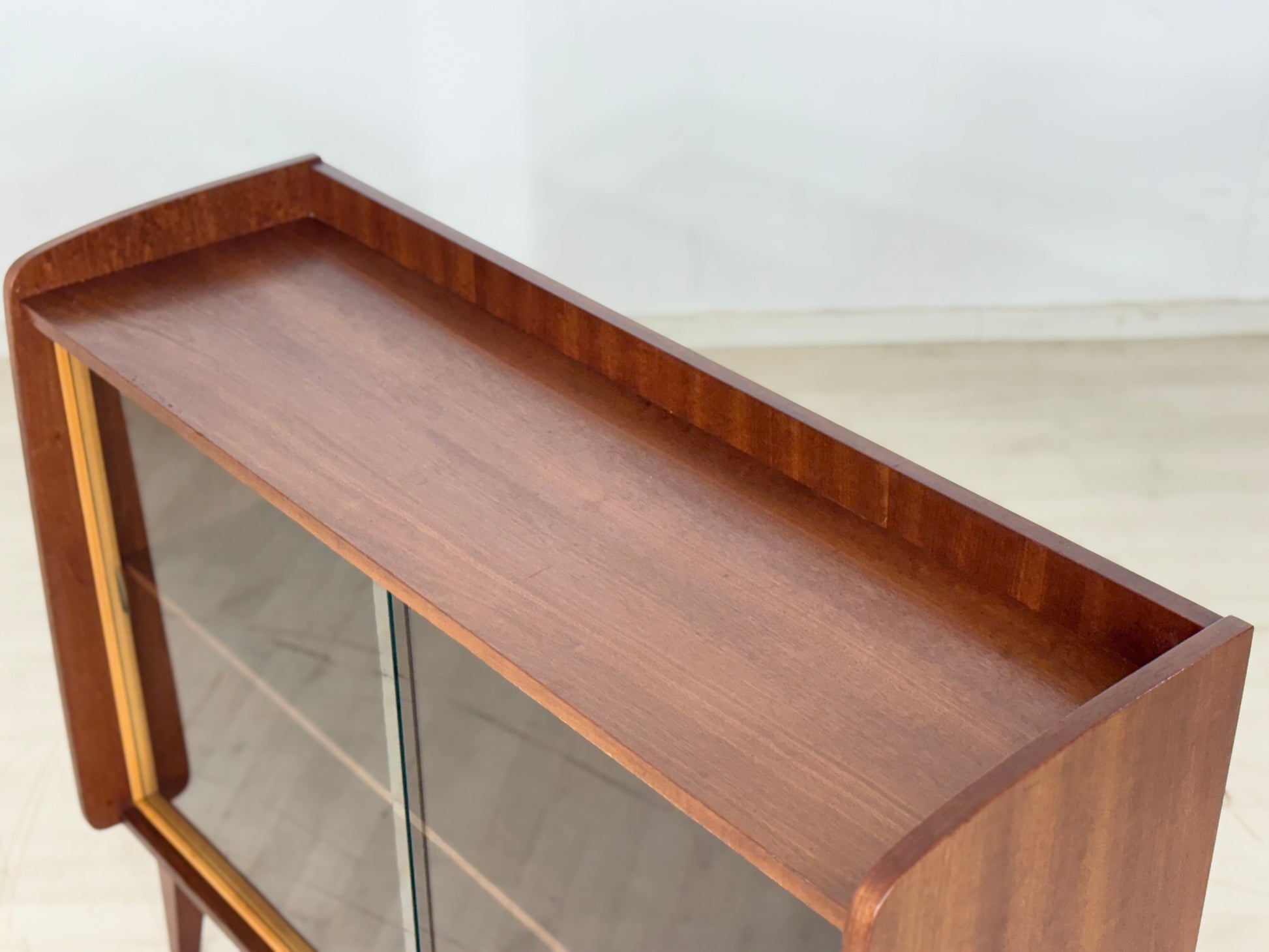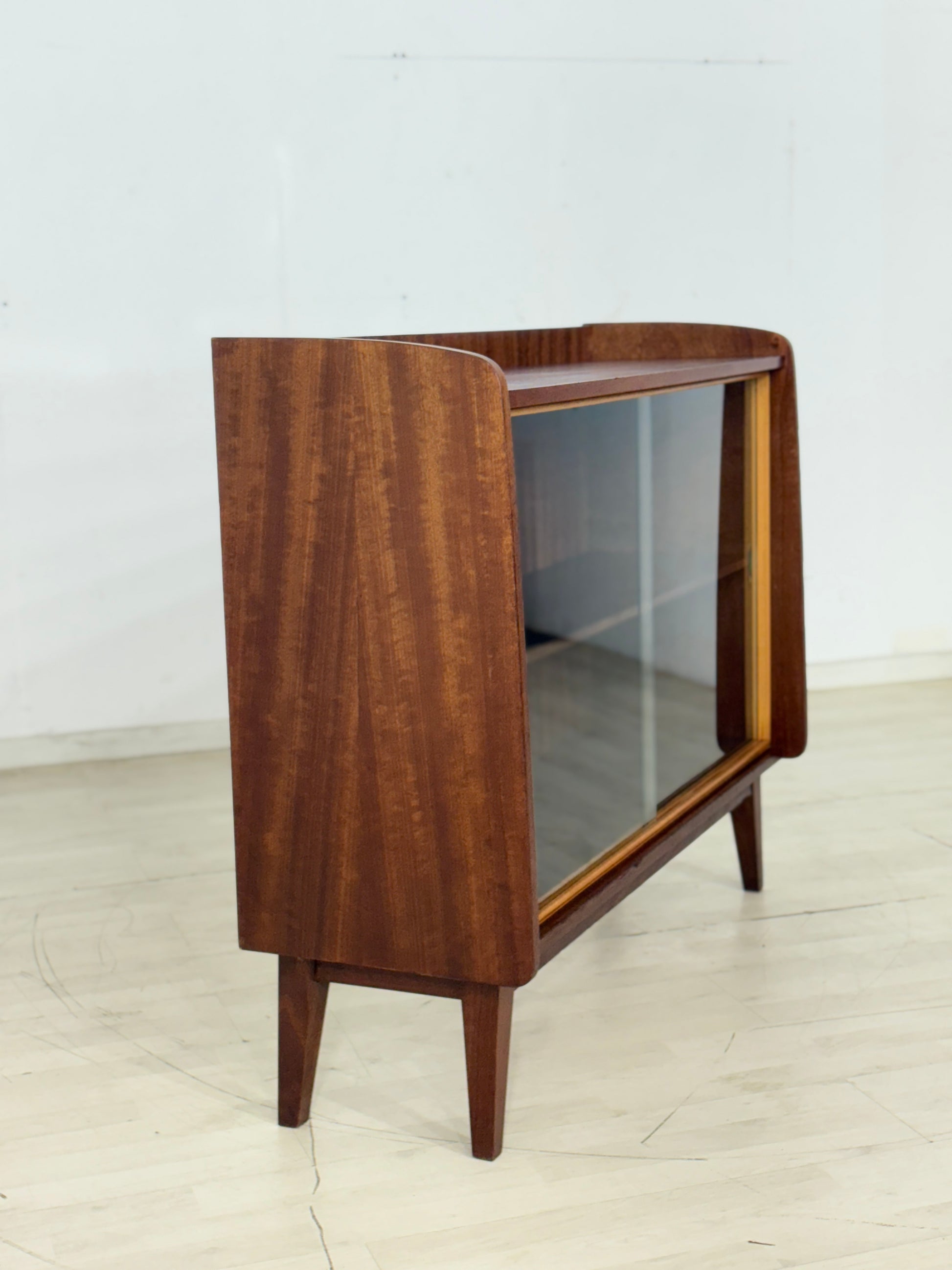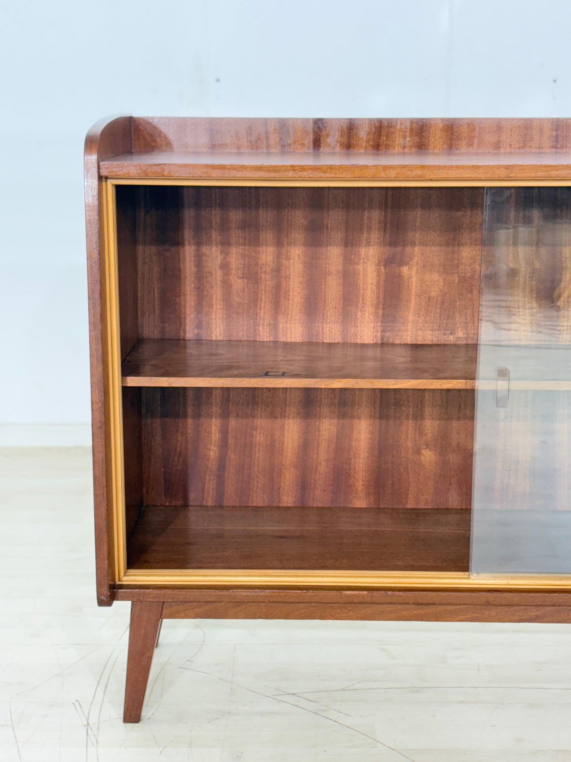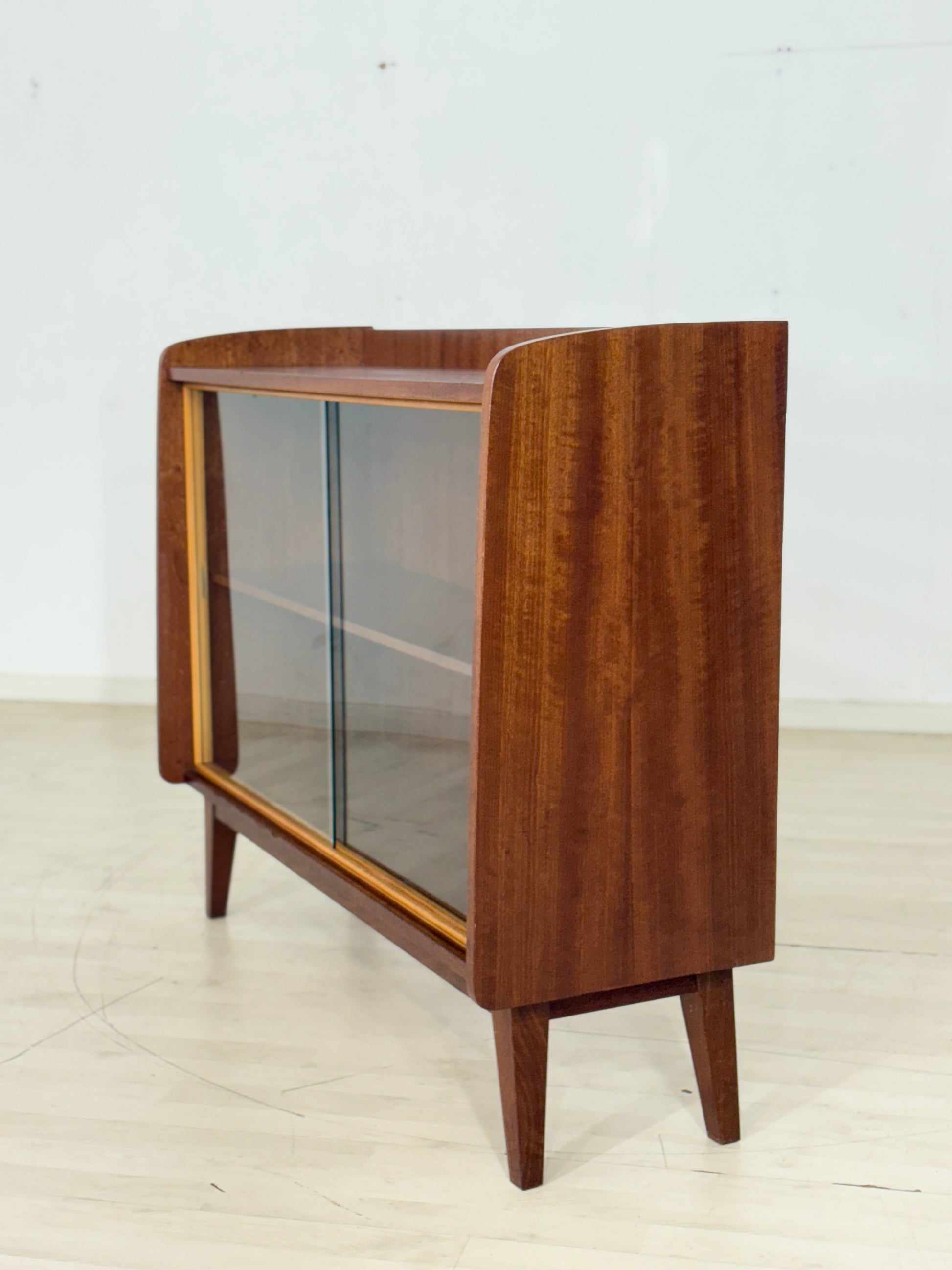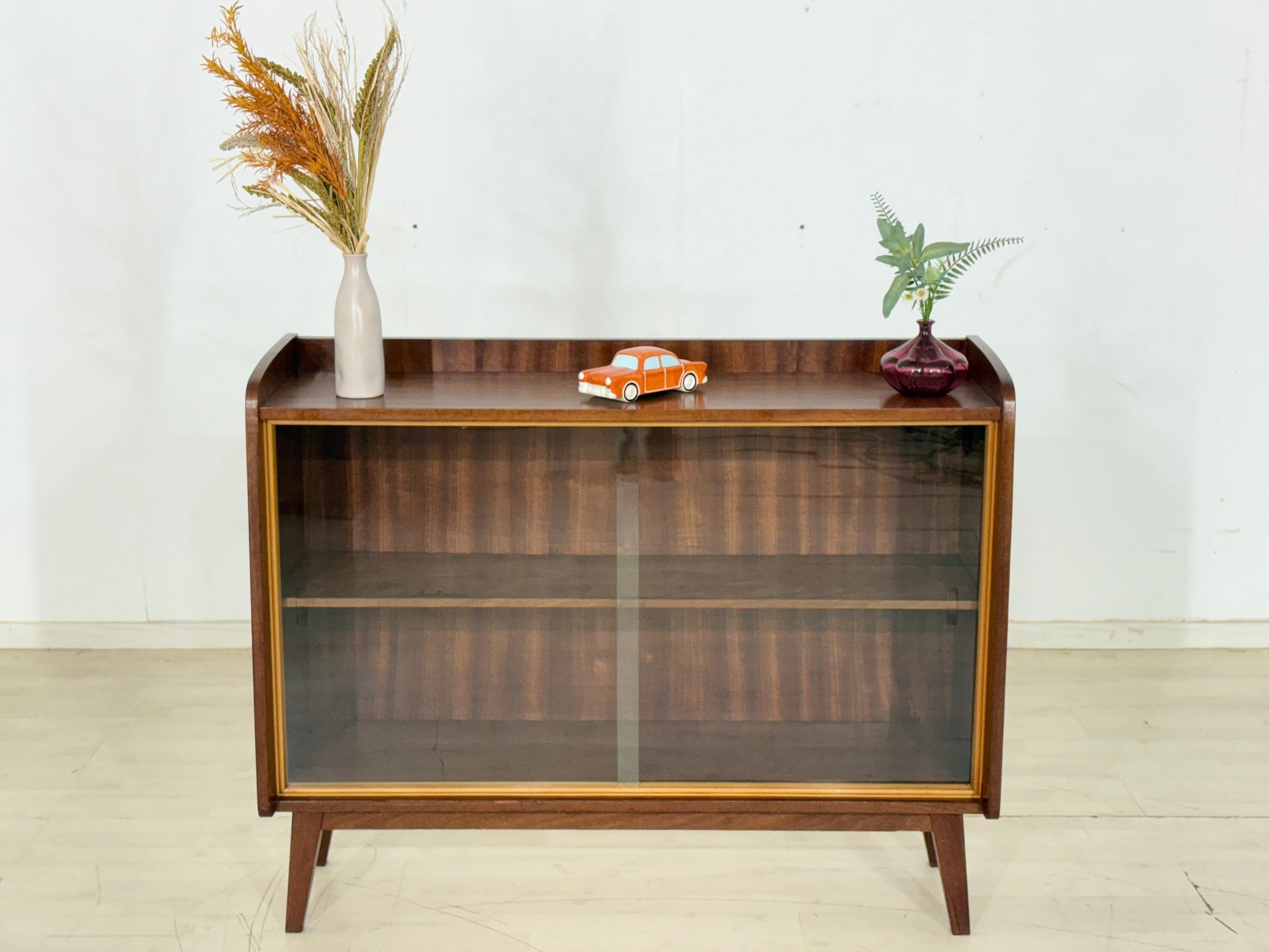 Zum Verkauf steht eine sehr schöne, kompakte Vitrine aus den 1960er Jahren. Mit ihren zwei eleganten Glasschiebetüren bewahrt sie Ihre Lieblingsstücke stilvoll auf. Ihre wunderschöne Vintage-Optik macht sie zu einem zeitlosen Möbelstück, das sich perfekt in jeden Wohnbereich einfügt und dort einen besonderen Akzent setzt.