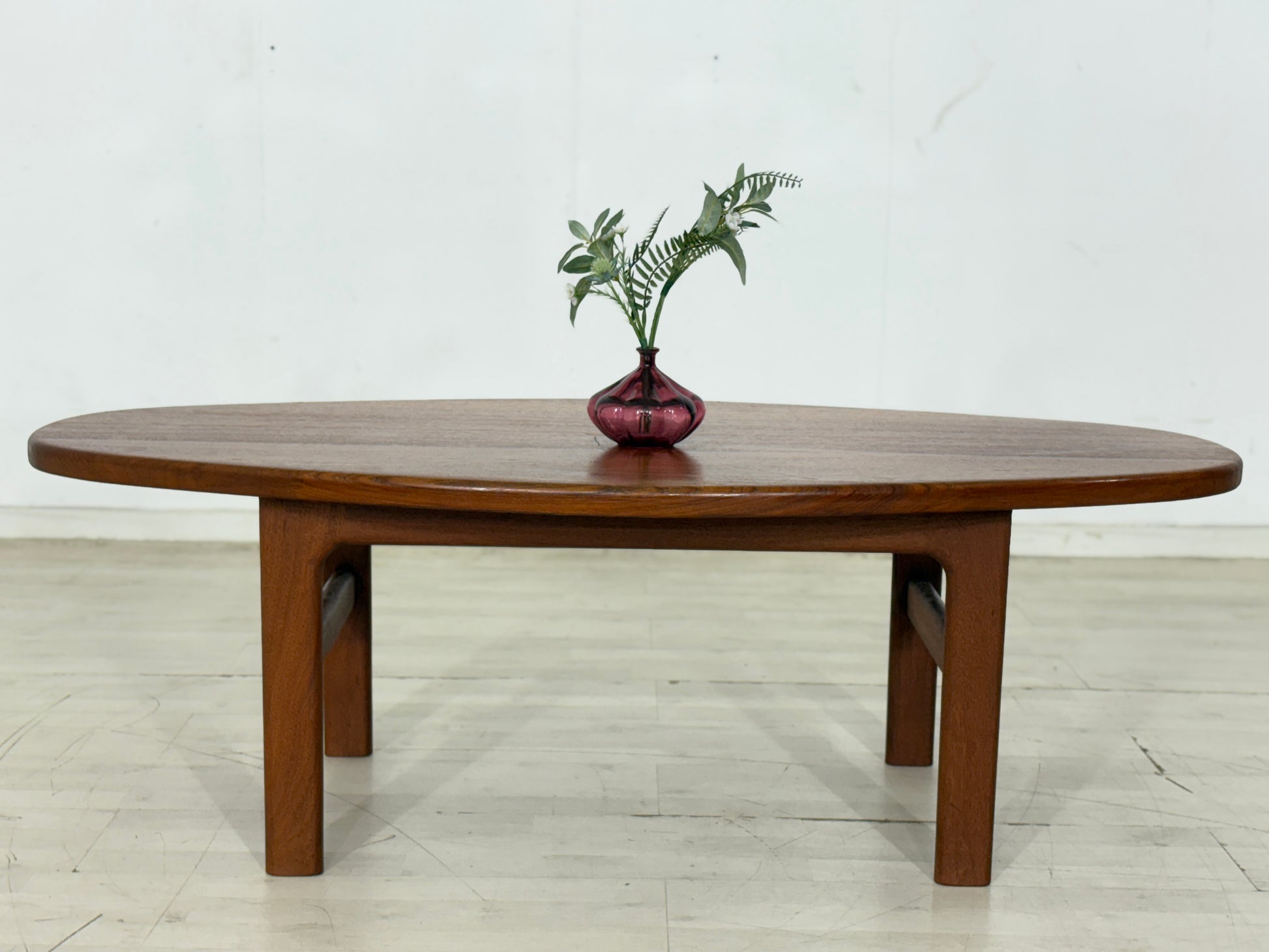 Zum Verkauf steht ein eleganter Couchtisch des dänischen Designers Niels Bach. Gefertigt aus Teakholz, besticht der Tisch durch seine wunderschöne Maserung, den warmen Farbton und das zeitlos schlichte, ovale Design. Er verleiht Ihrem Wohnbereich eine skandinavische und warme Atmosphäre.