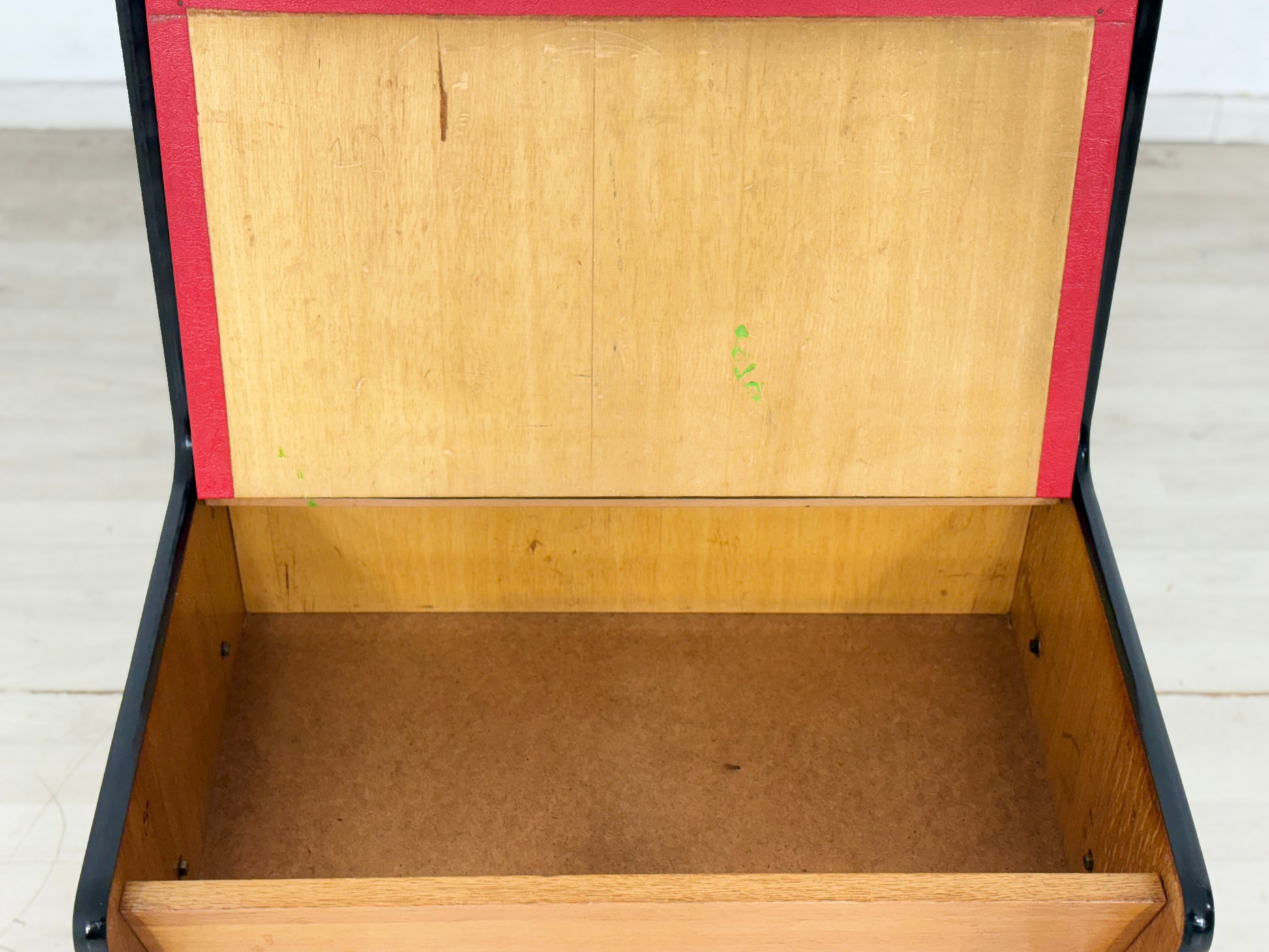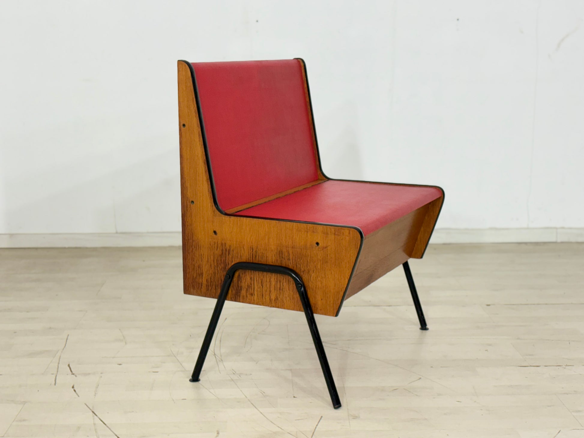 Zum Verkauf steht eine außergewöhnliche Vintage-Sitzbank, die durch ihre markante Formsprache und den spannenden Materialmix besticht. Der Korpus aus warmem Echtholz (Eiche) harmoniert perfekt mit den minimalistischen schwarzen Metallfüßen und dem leuchtend roten Polster.