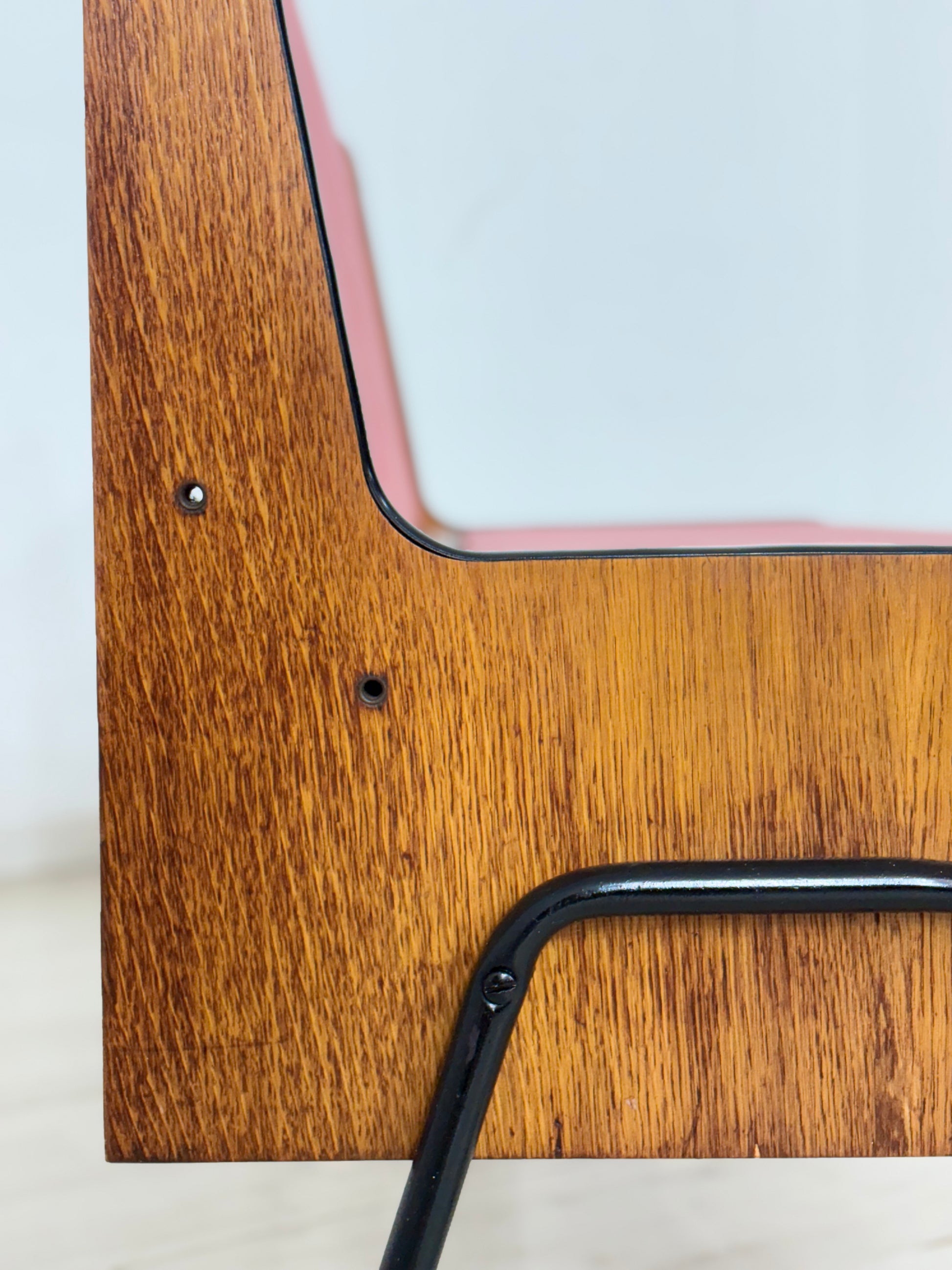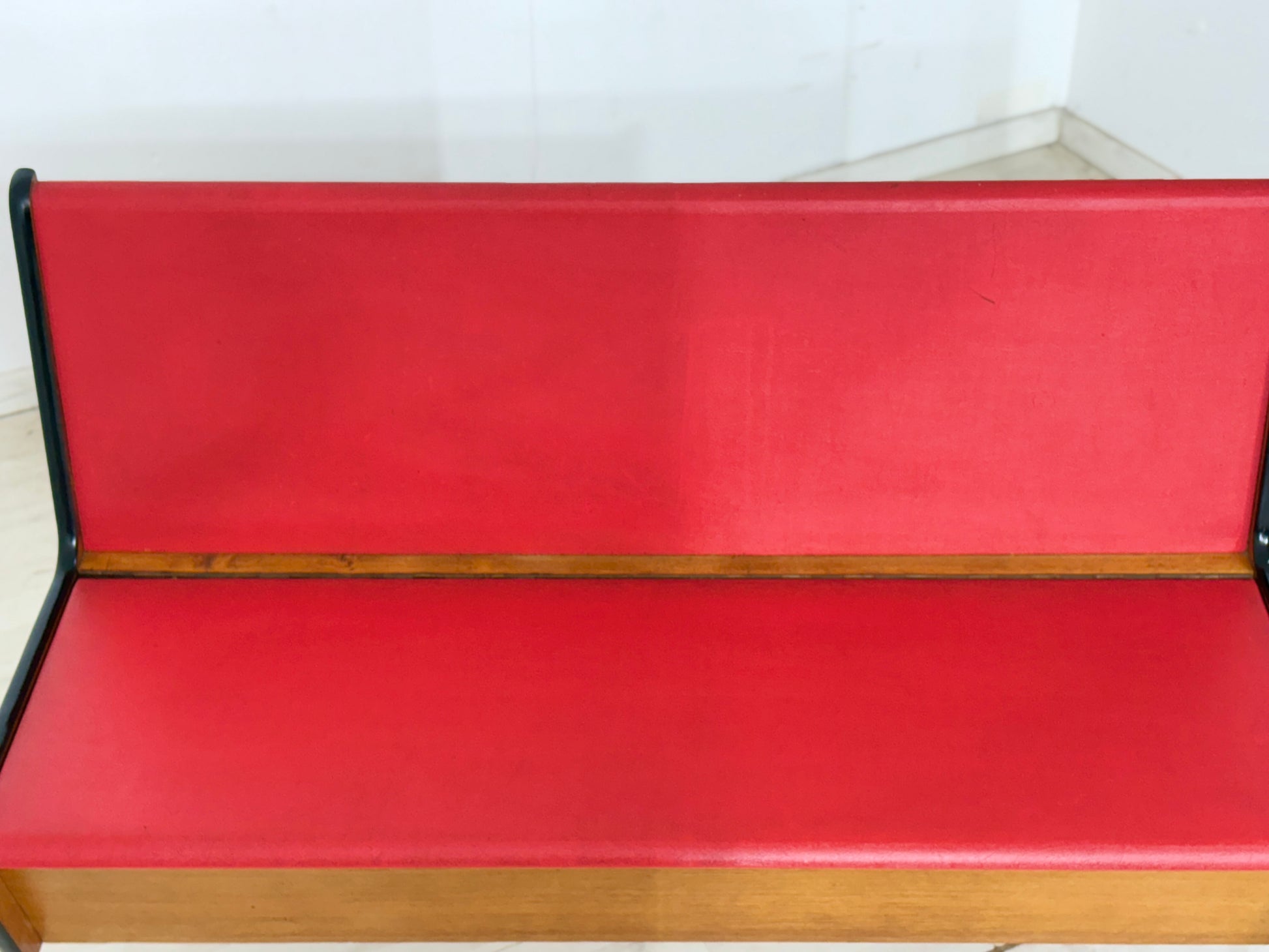 Zum Verkauf steht eine außergewöhnliche Vintage-Sitzbank, die durch ihre markante Formsprache und den spannenden Materialmix besticht. Der Korpus aus warmem Echtholz (Eiche) harmoniert perfekt mit den minimalistischen schwarzen Metallfüßen und dem leuchtend roten Polster.