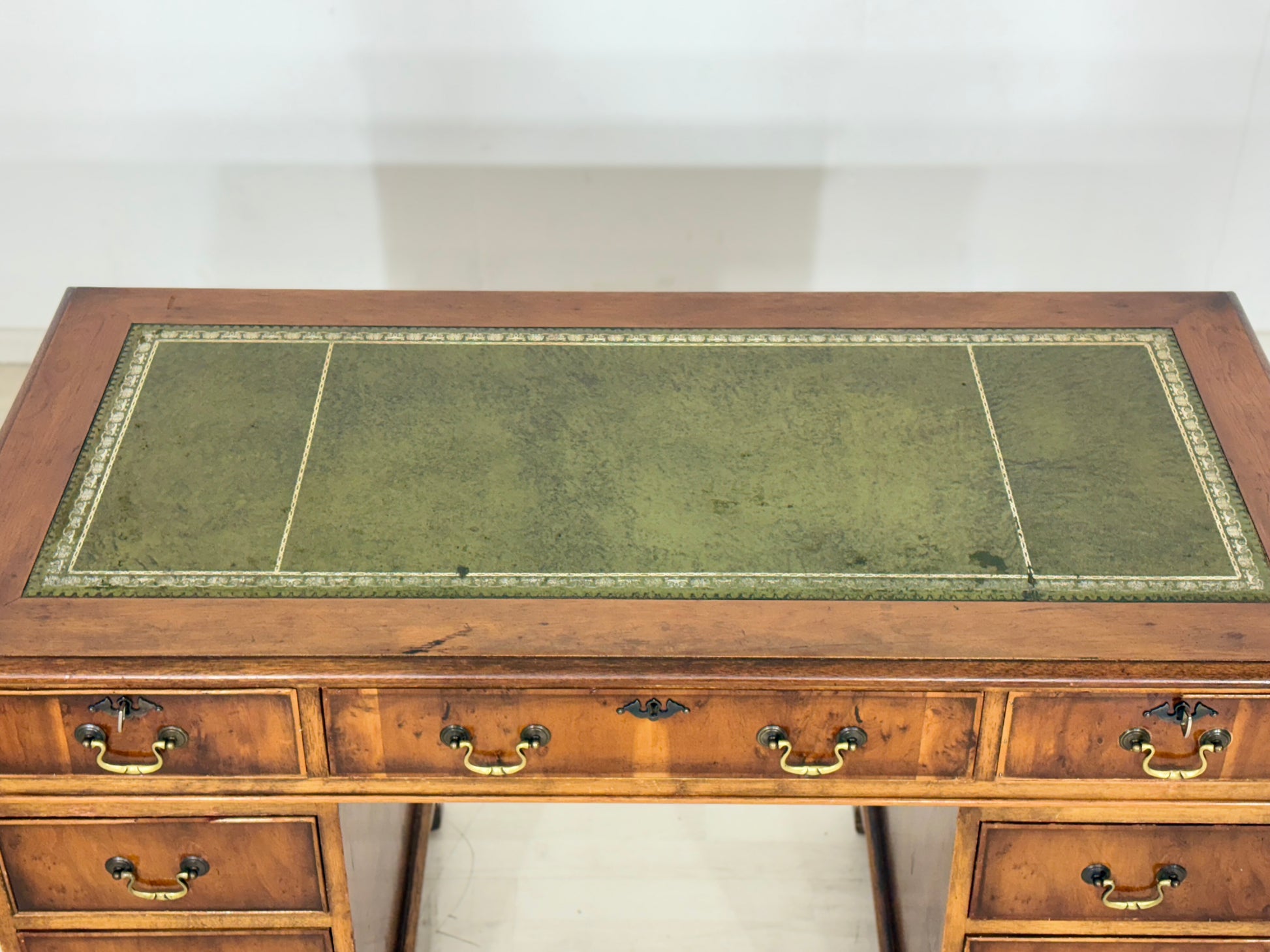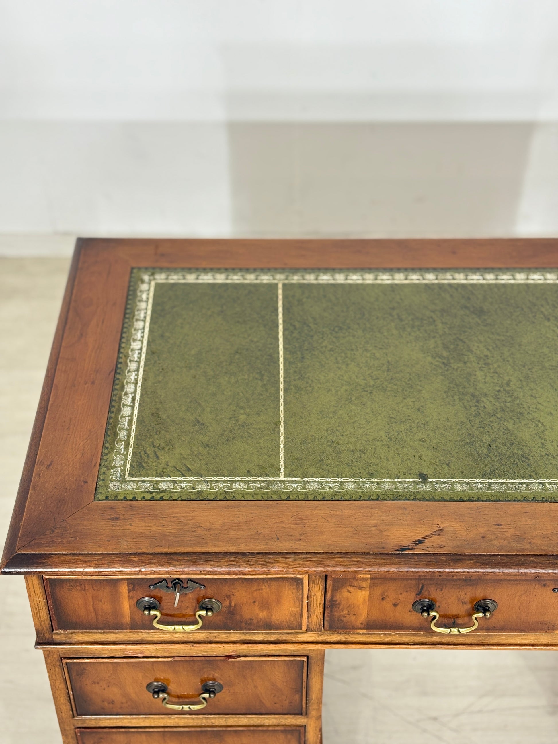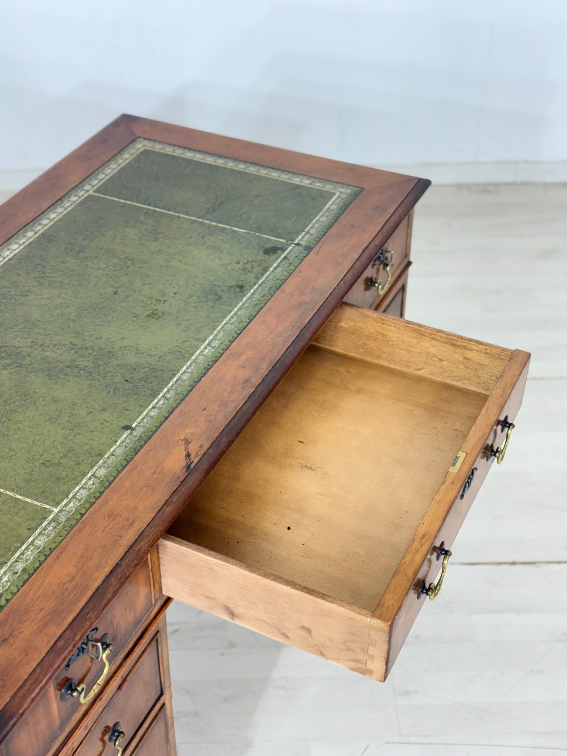 Der Schreibtisch ist aus massivem Holz Mahagoni gefertigt und verfügt über eine originale, stilvolle Lederauflage auf der Arbeitsfläche, die dem Möbel einen eleganten und traditionellen Charakter verleiht.